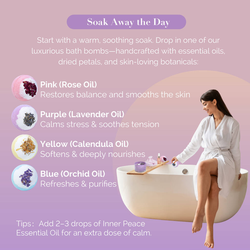 Each bath bomb is handmade using natural, skin-loving ingredients and infused with soothing scents like lavender, rose and jasmine.