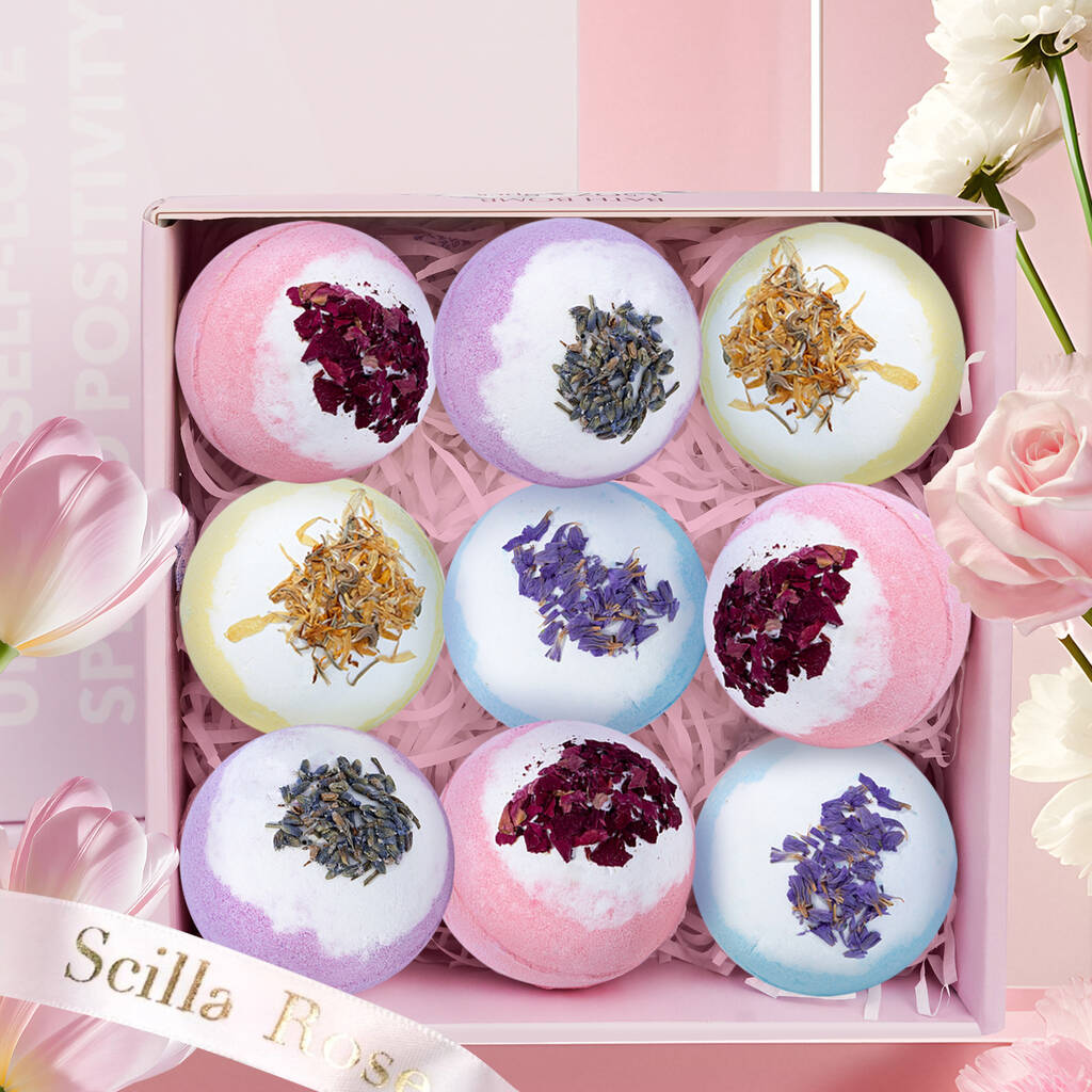 A gorgeous 9-piece bath bomb gift set for women and girls – perfect for birthdays, thank-you gifts, graduations, or Christmas. Handmade and beautifully boxed.