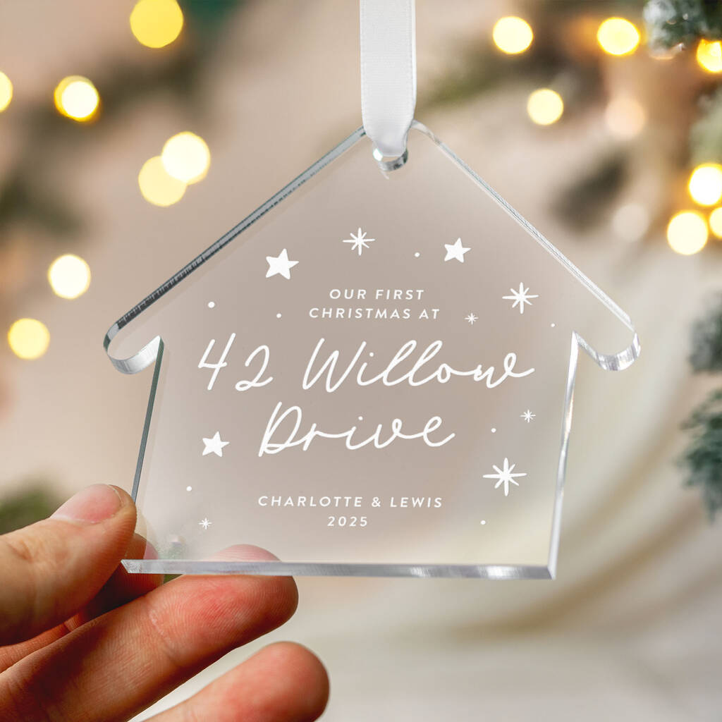 Celebrate your First Christmas at New Home with this personalised house ornament featuring custom address and couple names.