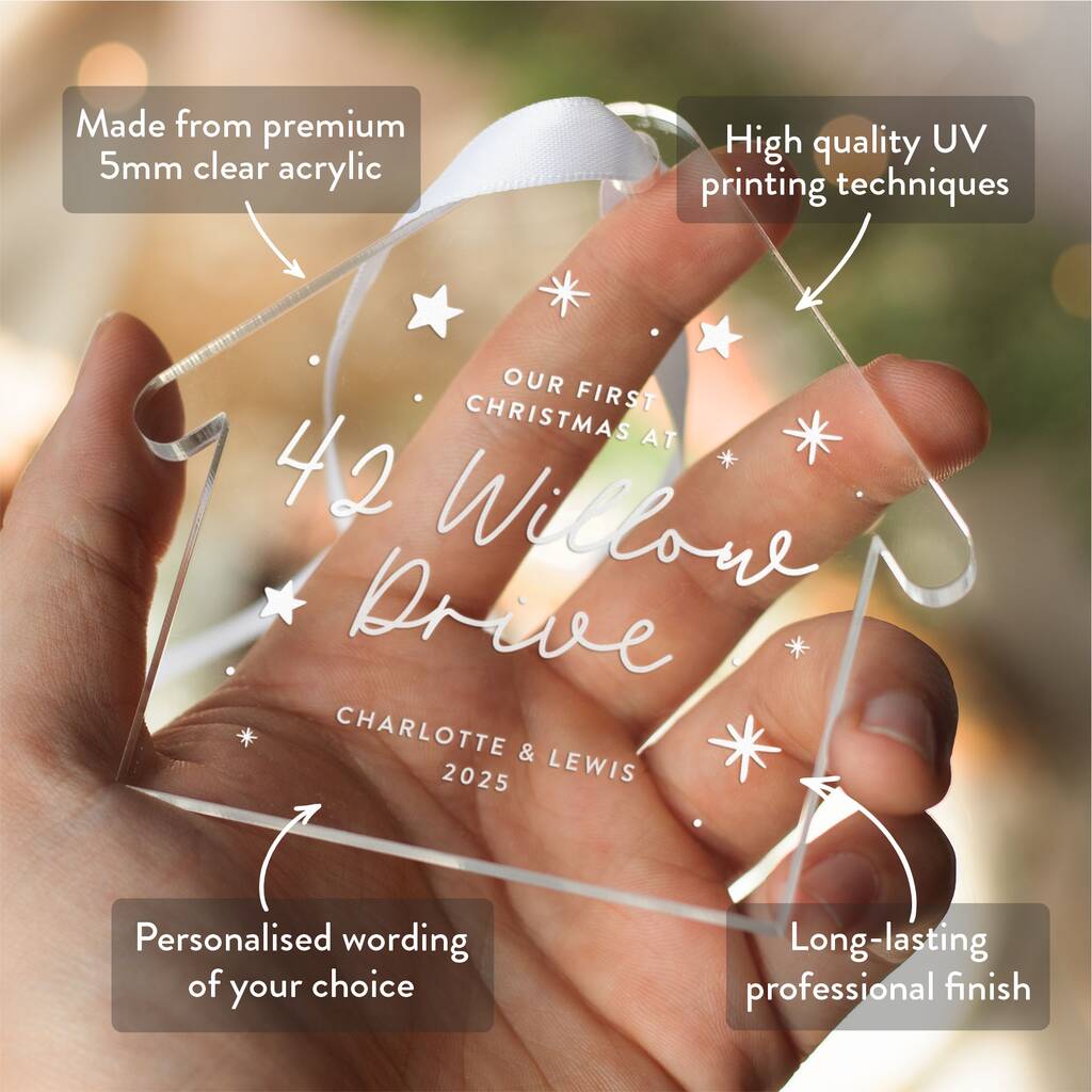 Perfect for Christmas 2025 celebrations and First Christmas at New Home milestones. This handcrafted acrylic ornament creates a luxury christmas keepsake that transforms your special address and couple names into a beautiful tree decoration, making it an ideal thoughtful housewarming gift for romantic milestone moments.