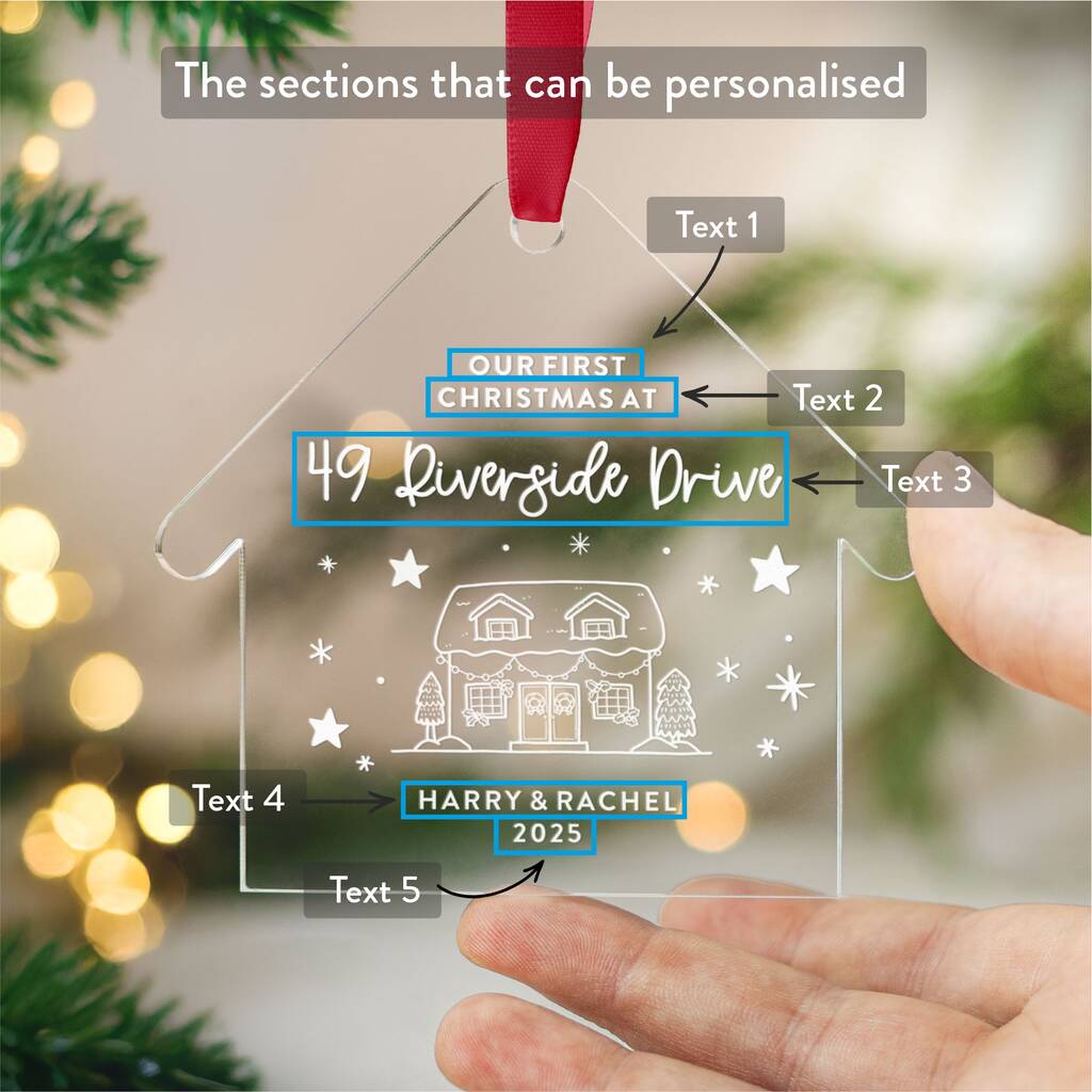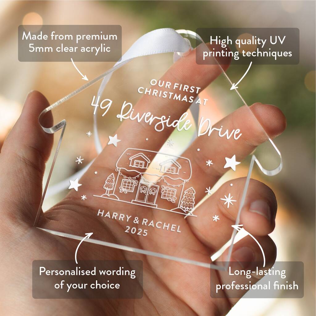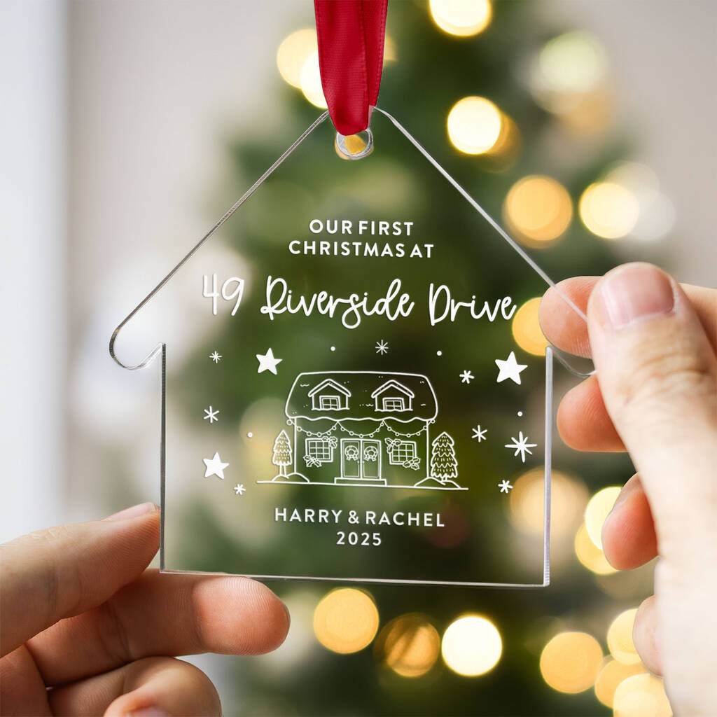 Beautiful personalised First Christmas ornament for new home celebrations. This custom address keepsake captures your milestone perfectly.