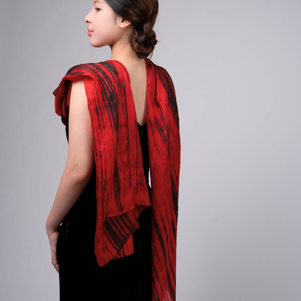 100% Mulberry Silk Scarf, Red And Black In Gift Box
