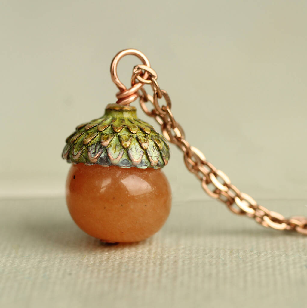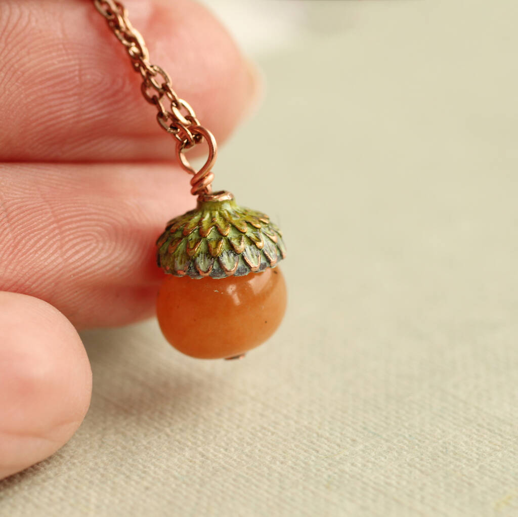 • Amber Orange Small Moss Acorn Necklace, thumbnail 9 of 9