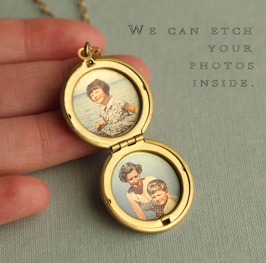 We can personalise this locket for you, using a carefully designed technique to transfer your photographs onto the metal of the pendant itself, for a really soft and unique vintage effect. Parts of your image will merge with the golden brass behind, creating a very beautiful, unusual and ethereal look.