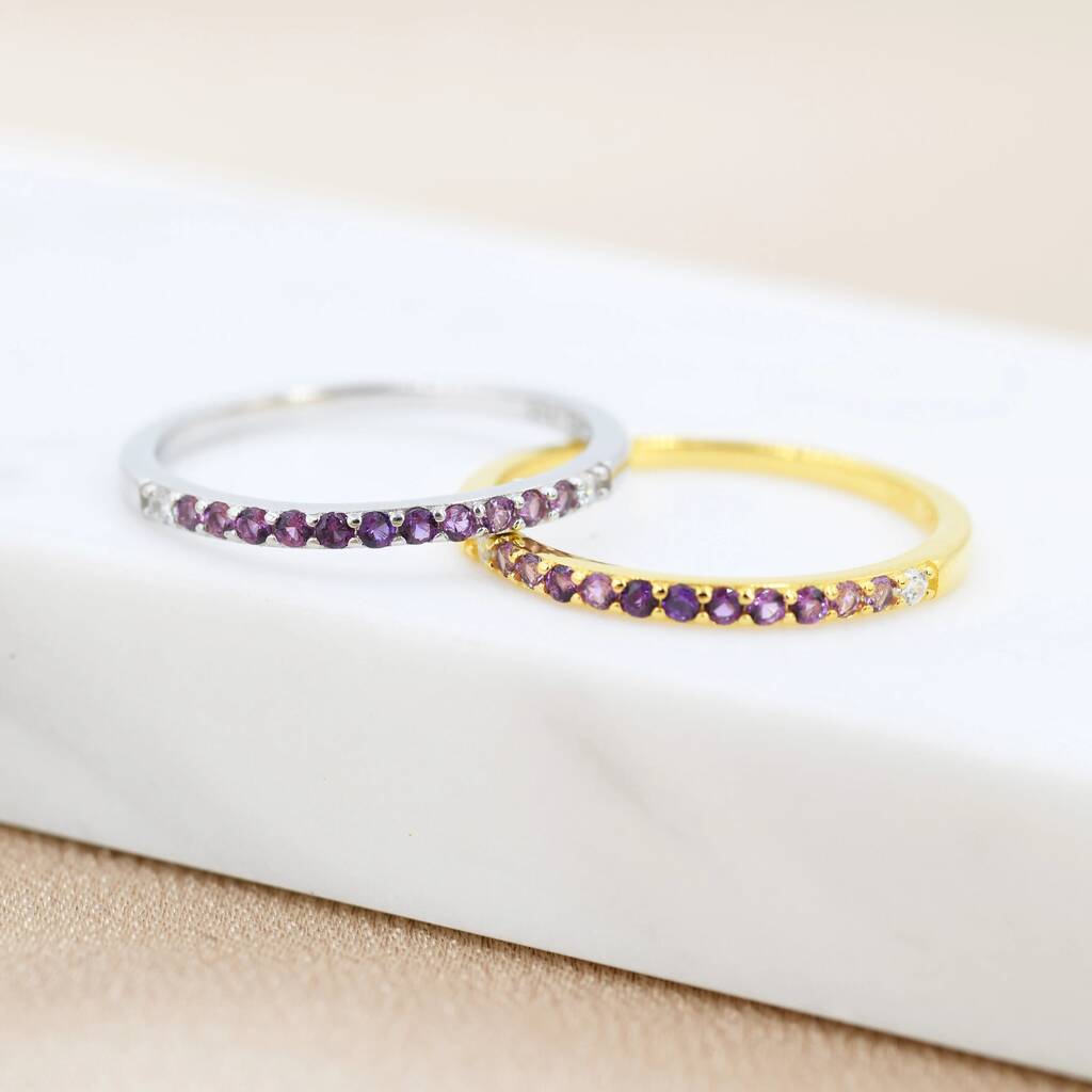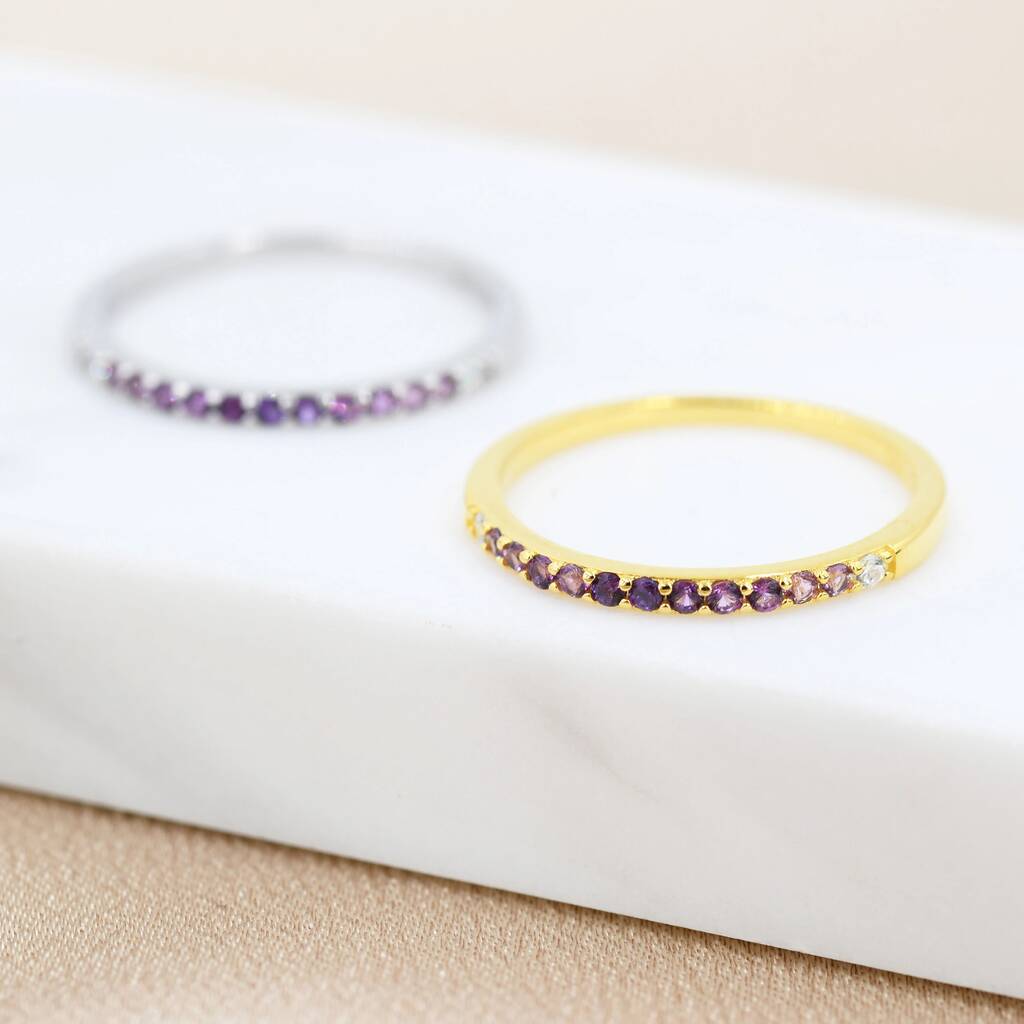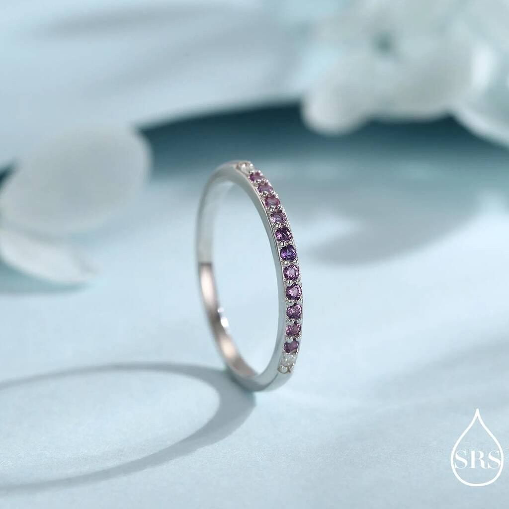 Stunning amethyst-purple ombre half eternity ring in sterling-silver. Illuminate your style with the regal beauty of amethyst. Perfect for adorning your fingers or gifting elegance.