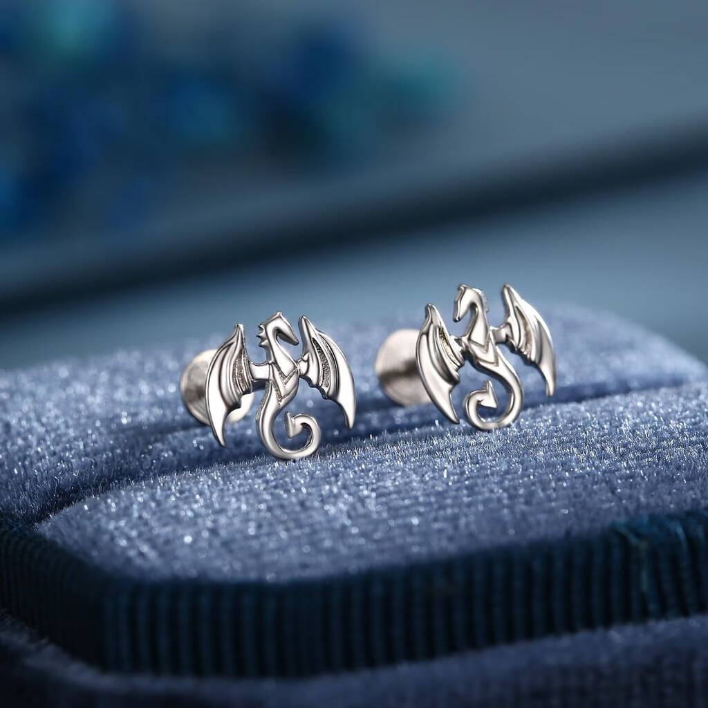 Sterling silver studs featuring intricate dragon designs with internally threaded flat backs, adding mythical charm, bold-elegance, and a unique, stylish touch to everyday-wear or gifting.