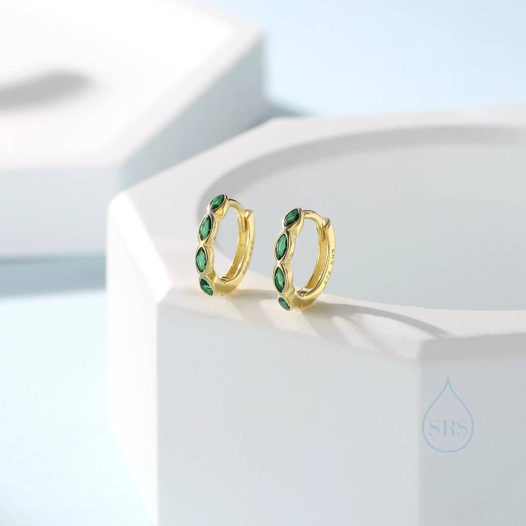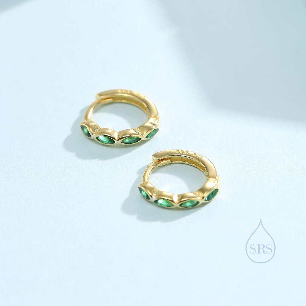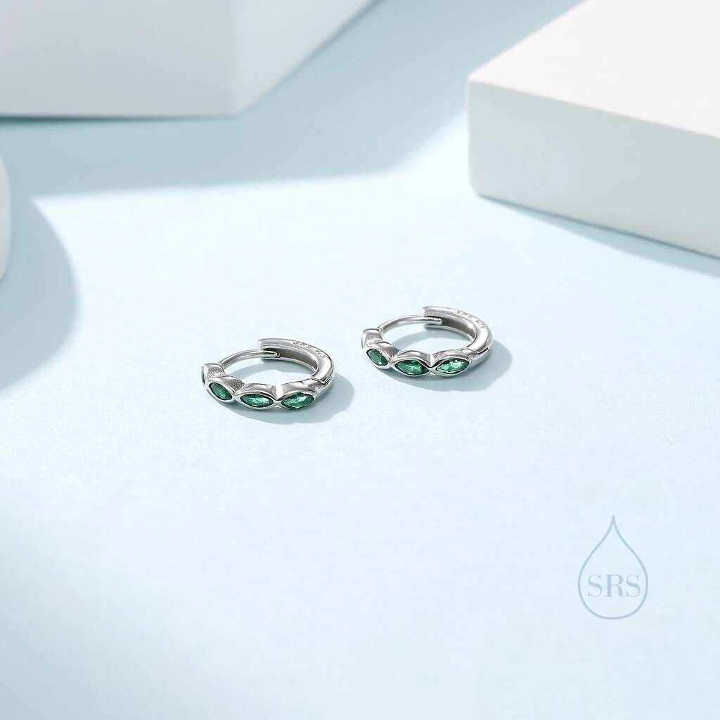 Elegant emerald green marquise CZ huggie hoop earrings in sterling silver. Radiate with regal-charm and vibrant elegance. Perfect for adorning your ears or gifting brilliance.