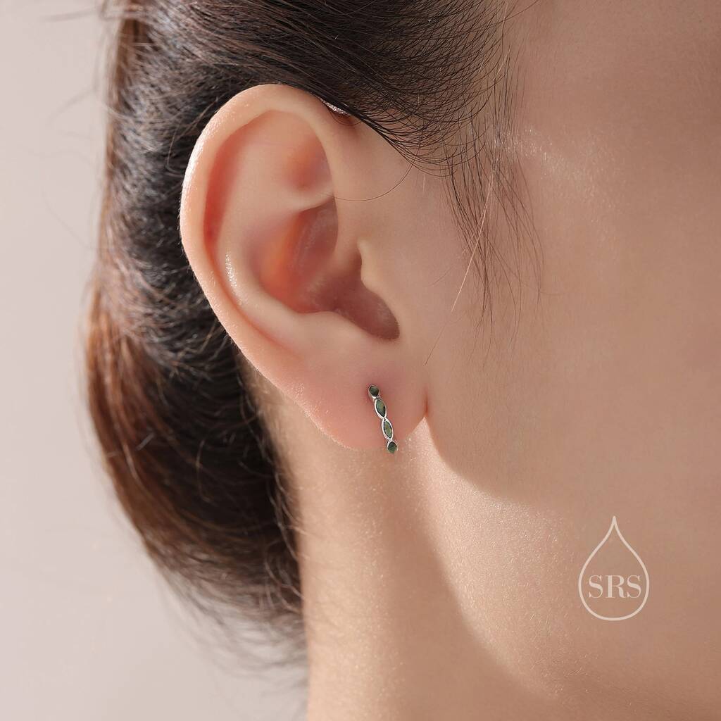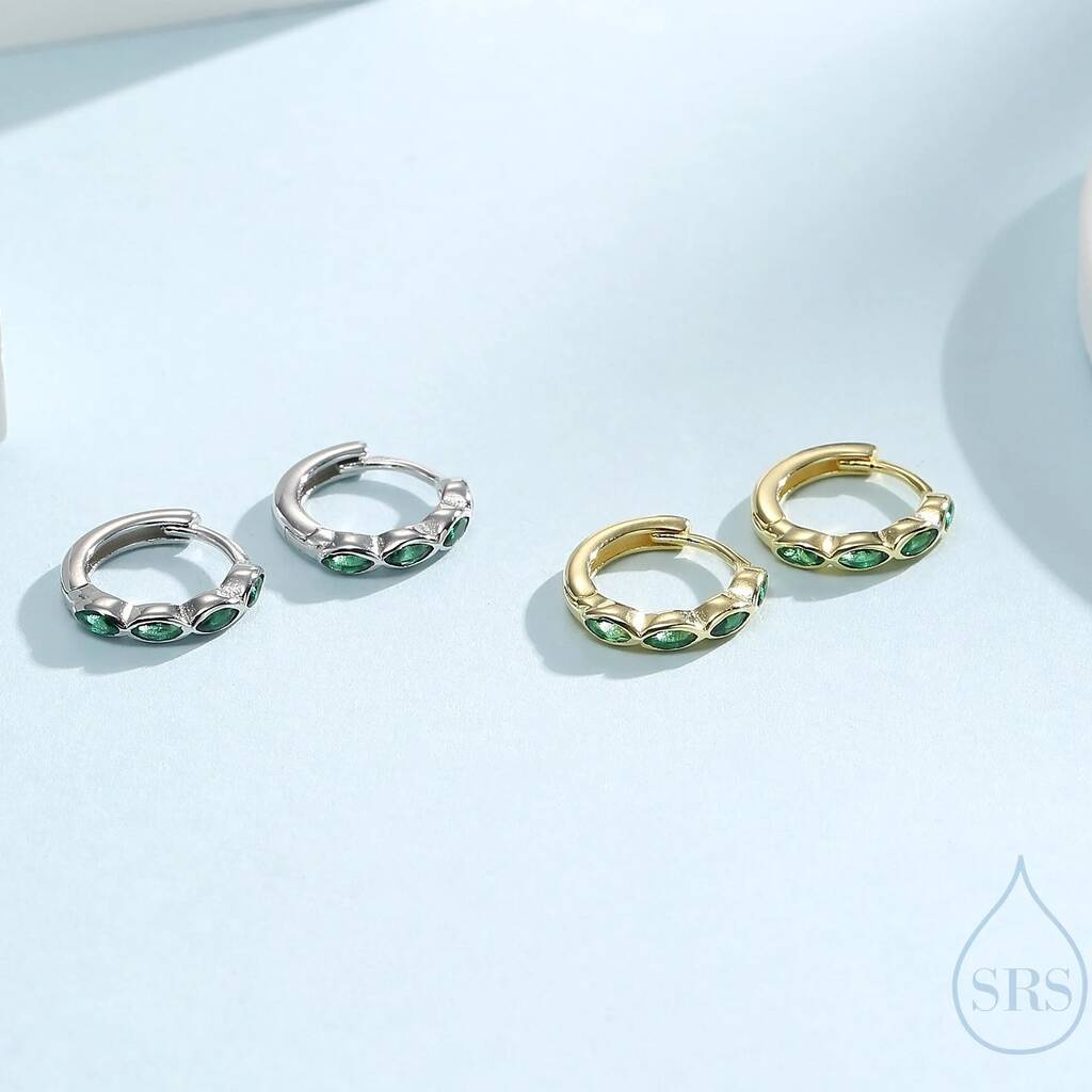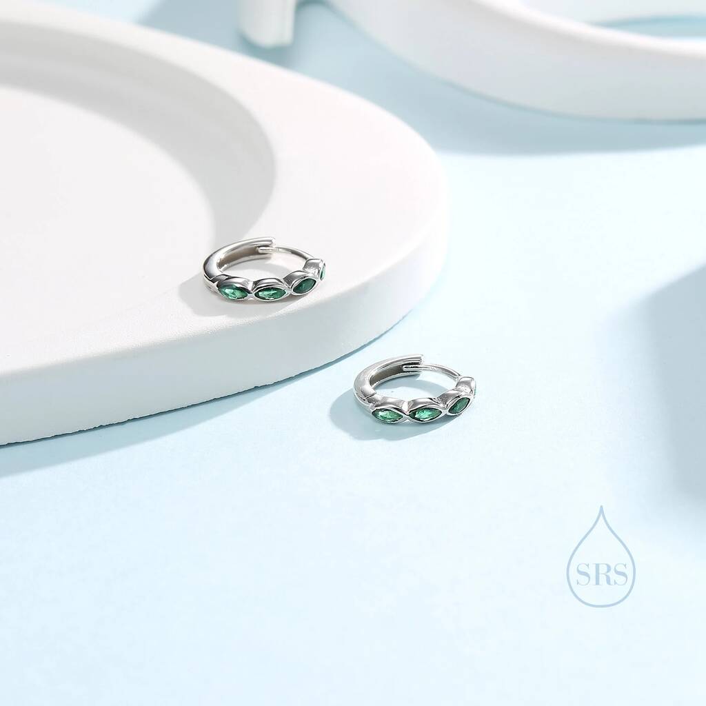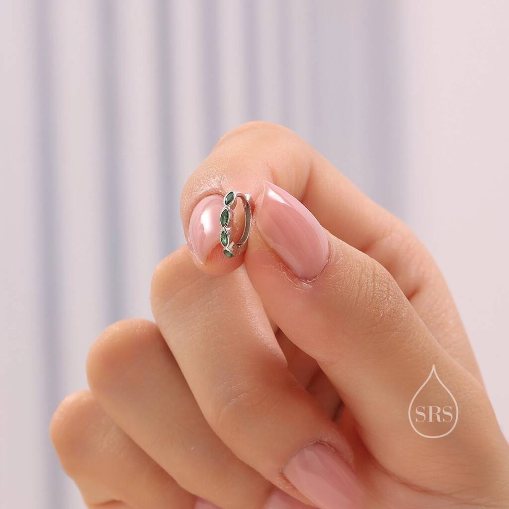 Elegant emerald green marquise CZ huggie hoop earrings in sterling silver. Radiate with regal-charm and vibrant elegance. Perfect for adorning your ears or gifting brilliance.
