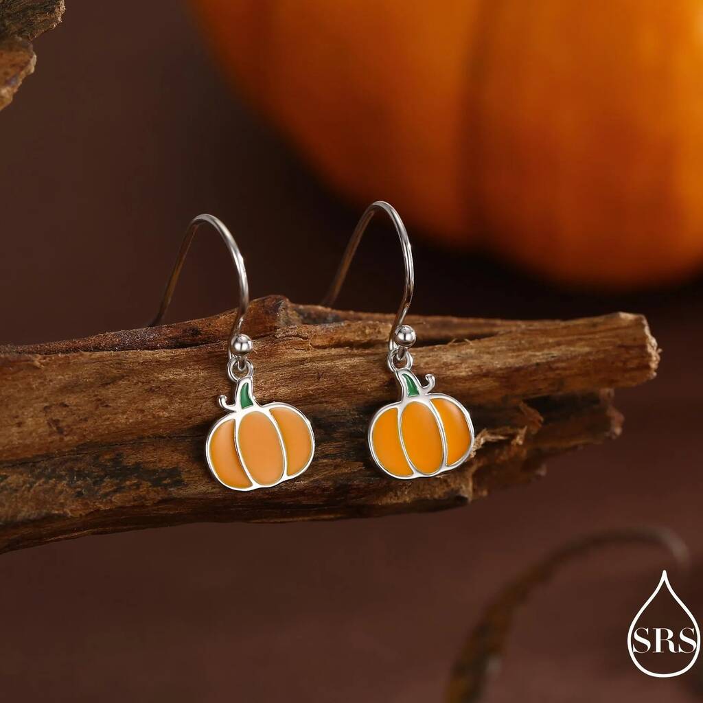Sterling silver drop hook earrings featuring enamel pumpkin designs, adding playful charm, festive flair, and a whimsical, stylish touch to everyday wear or seasonal celebrations.