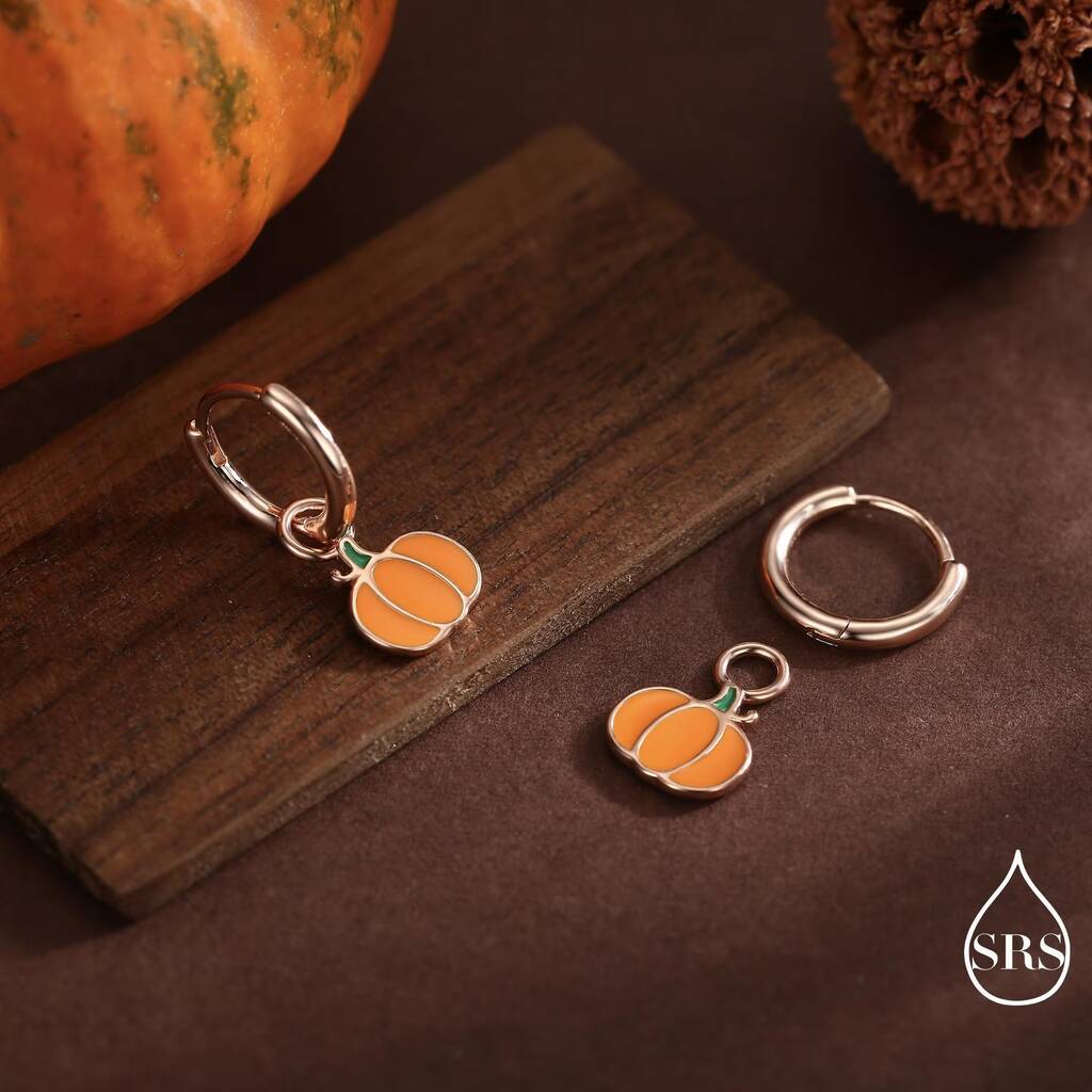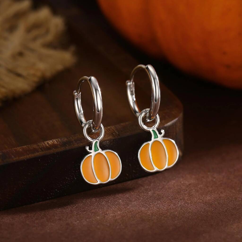 Sterling silver huggie hoop earrings featuring enamel pumpkin designs, adding playful charm, festive flair, and a whimsical, stylish touch to everyday wear or seasonal celebrations.