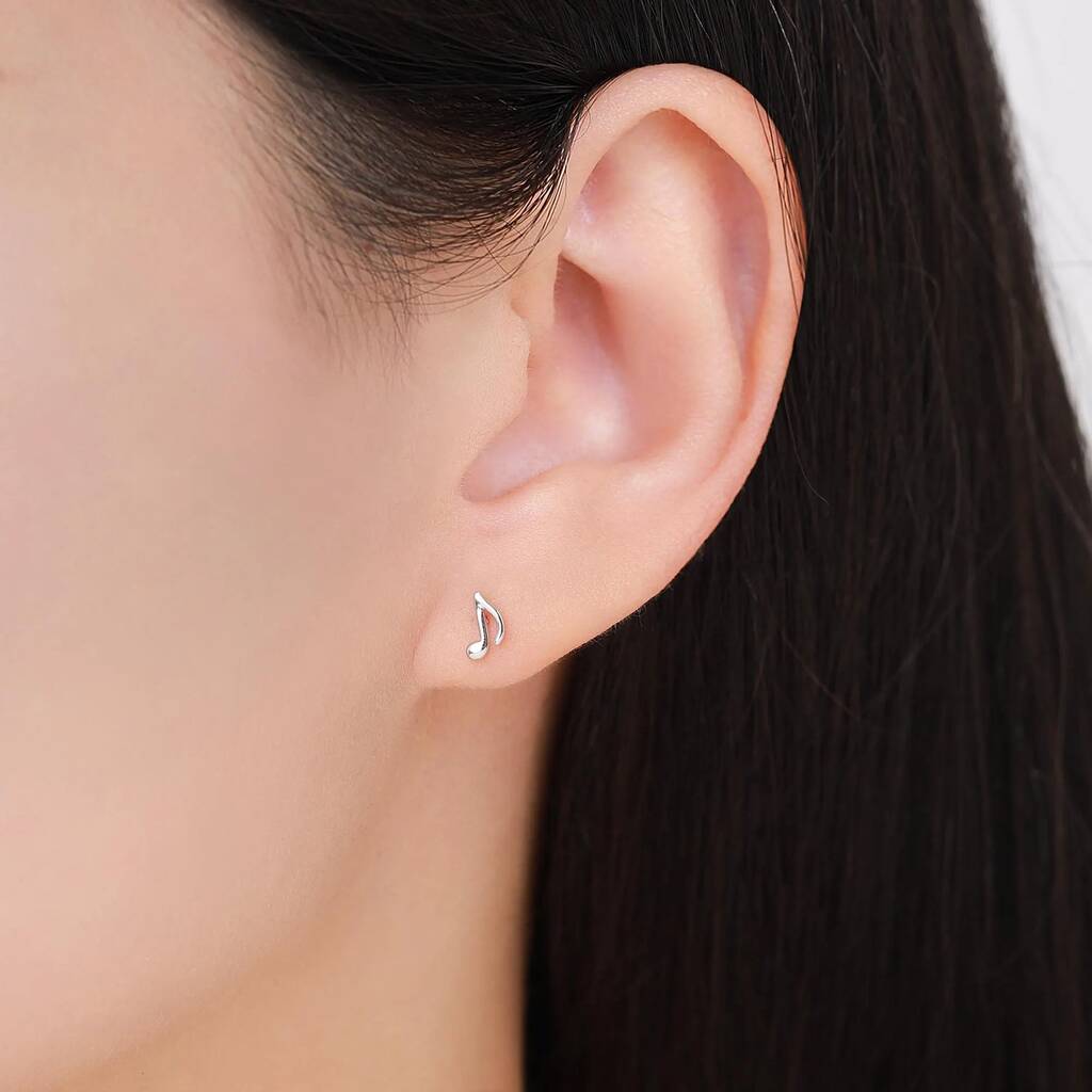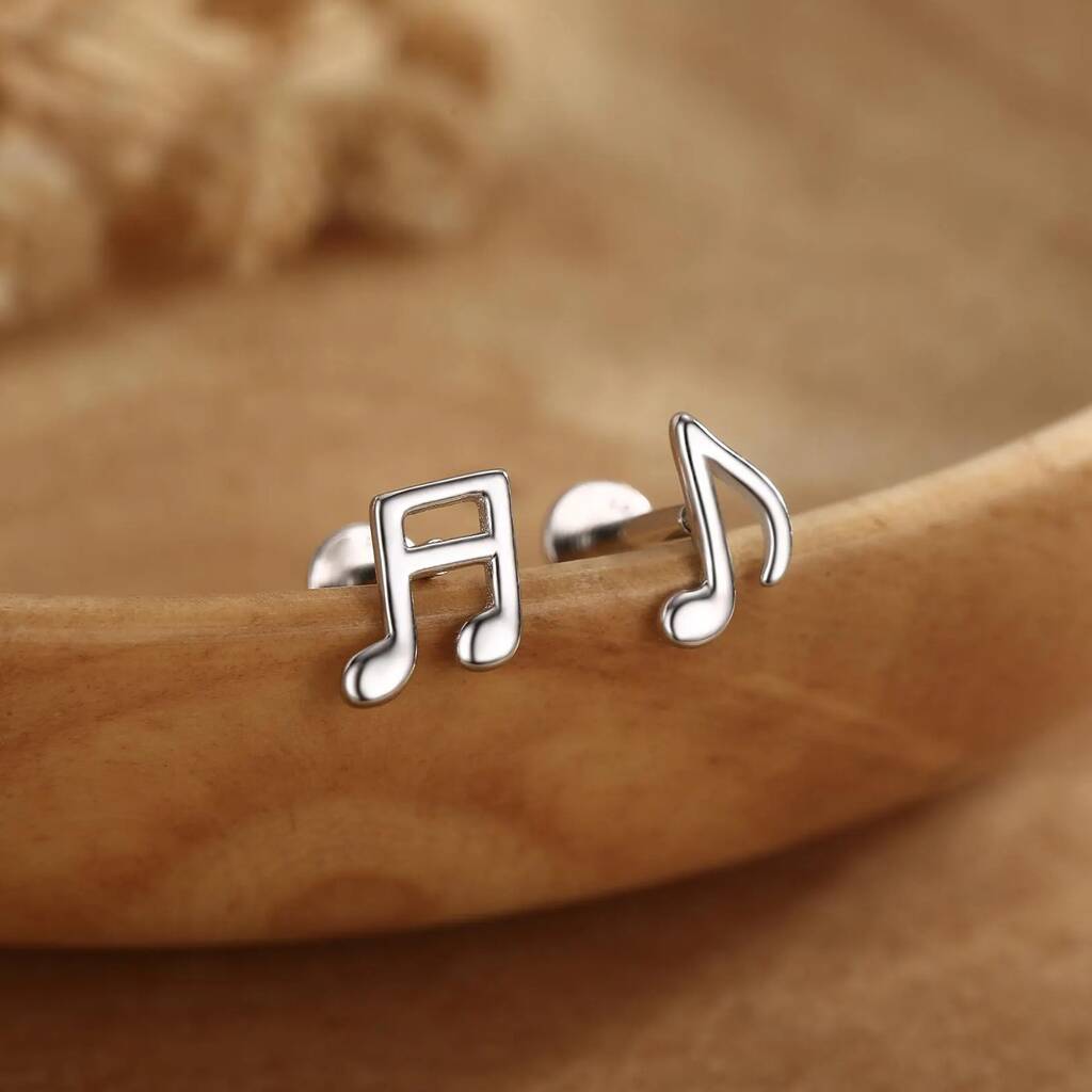 Delicate sterling silver studs featuring music note designs with internally threaded flat-backs, adding artistic charm, subtle elegance, and a playful, stylish-touch to everyday-wear or gifting.