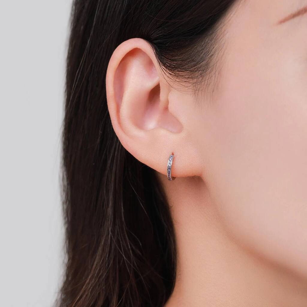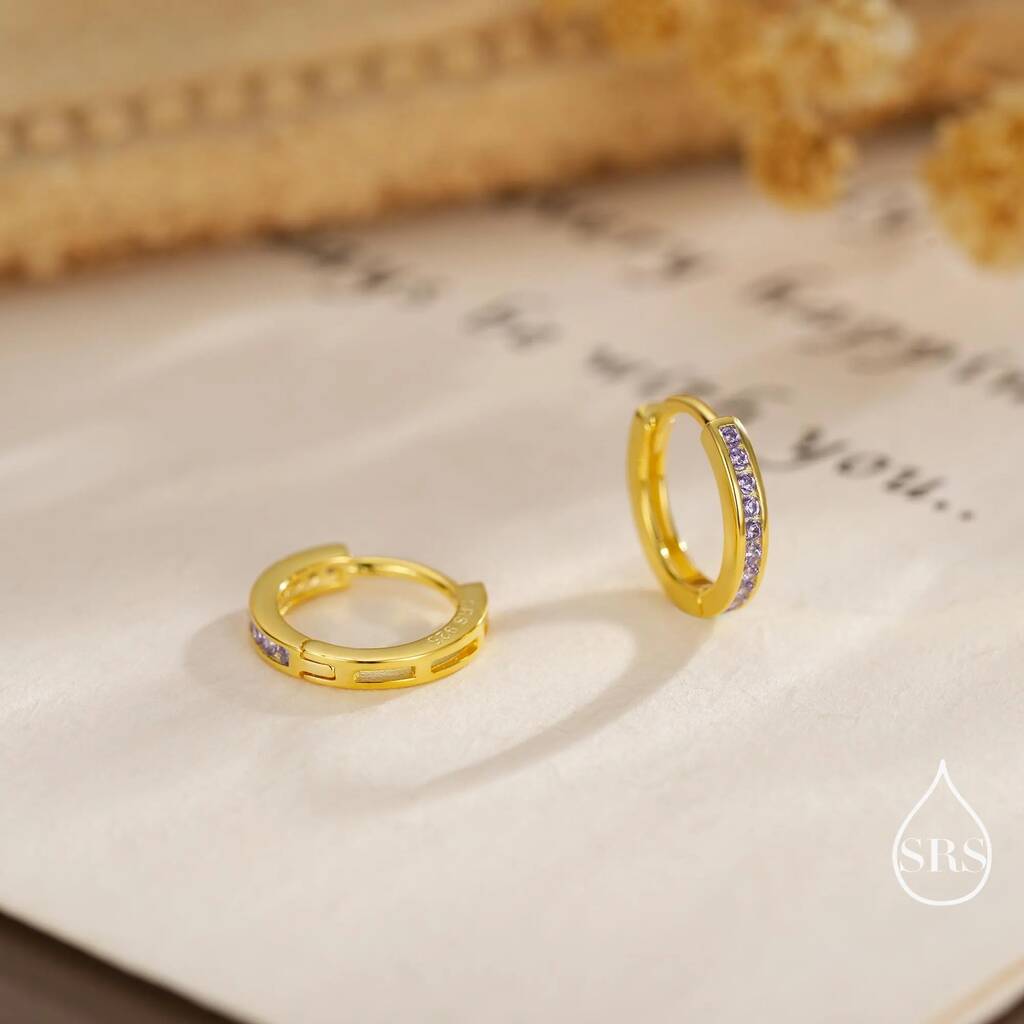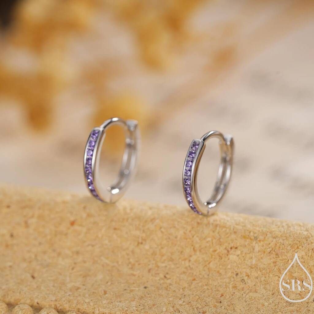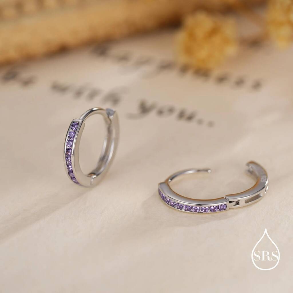 Elegant lilac purple amethyst CZ huggie hoop earrings in sterling-silver. Embrace the beauty of rich amethyst. Perfect for adding grace and charm to your ears.