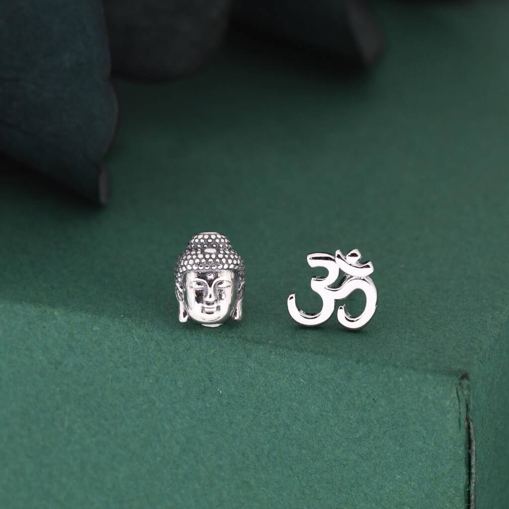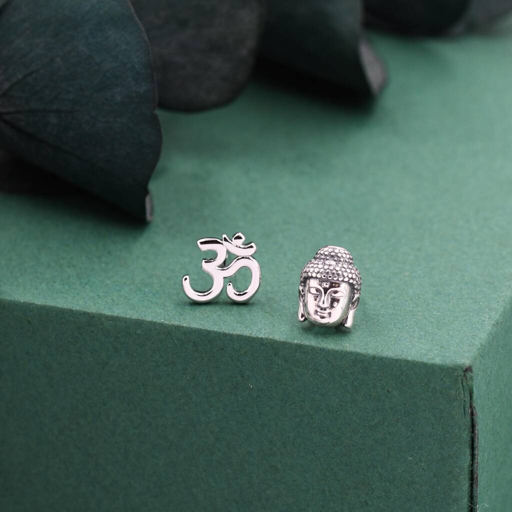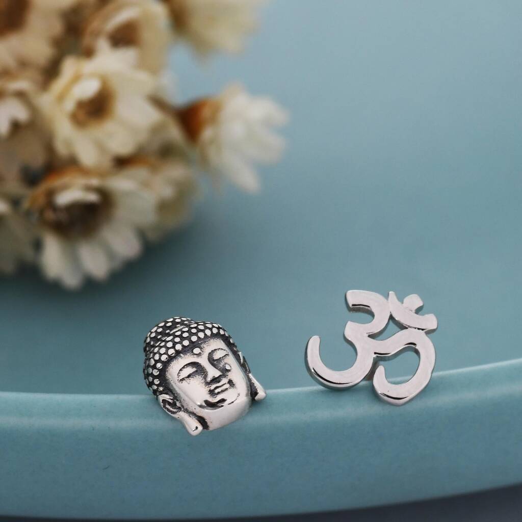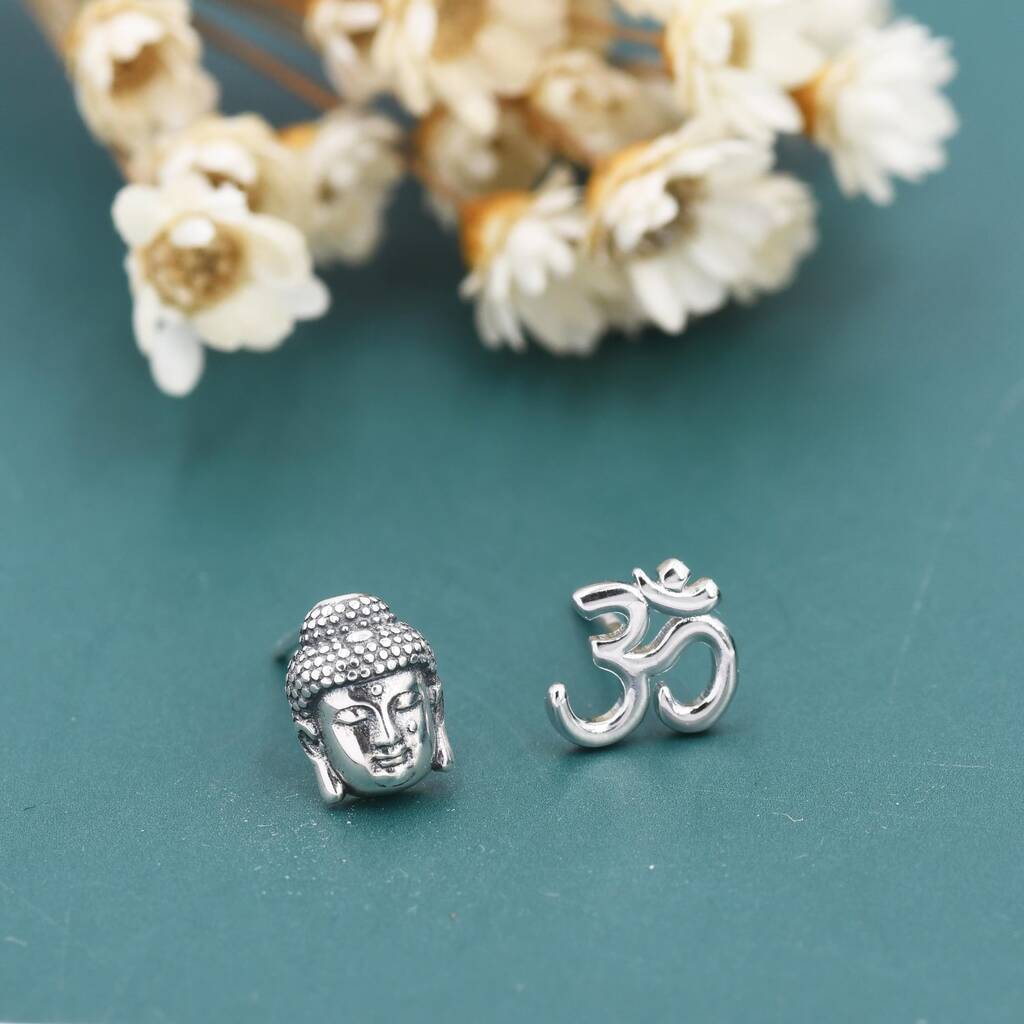 Mismatched Buddha Head and Om Stud Earrings in Sterling Silver — symbolic and spiritual design, combining serenity and harmony with a unique, meaningful style.