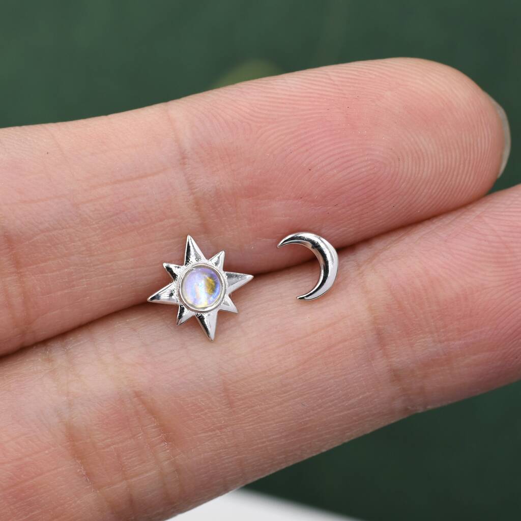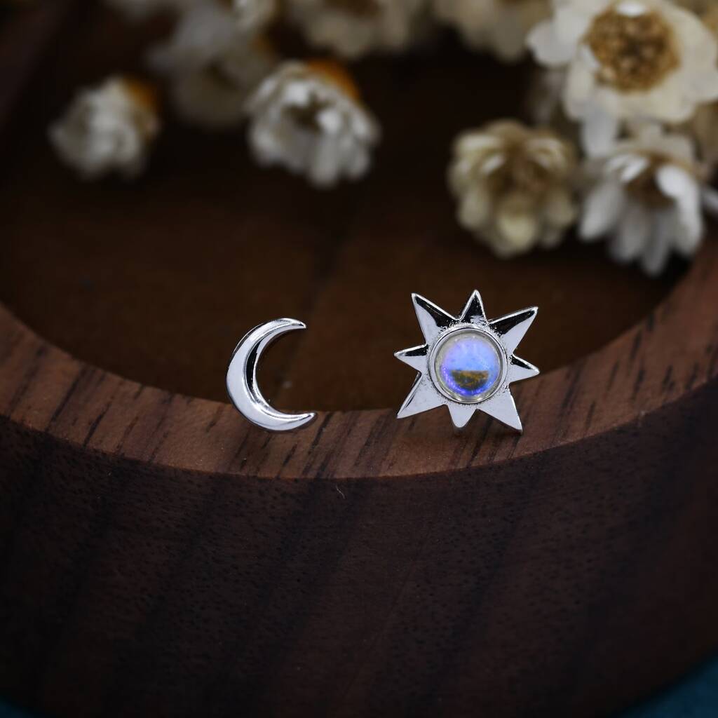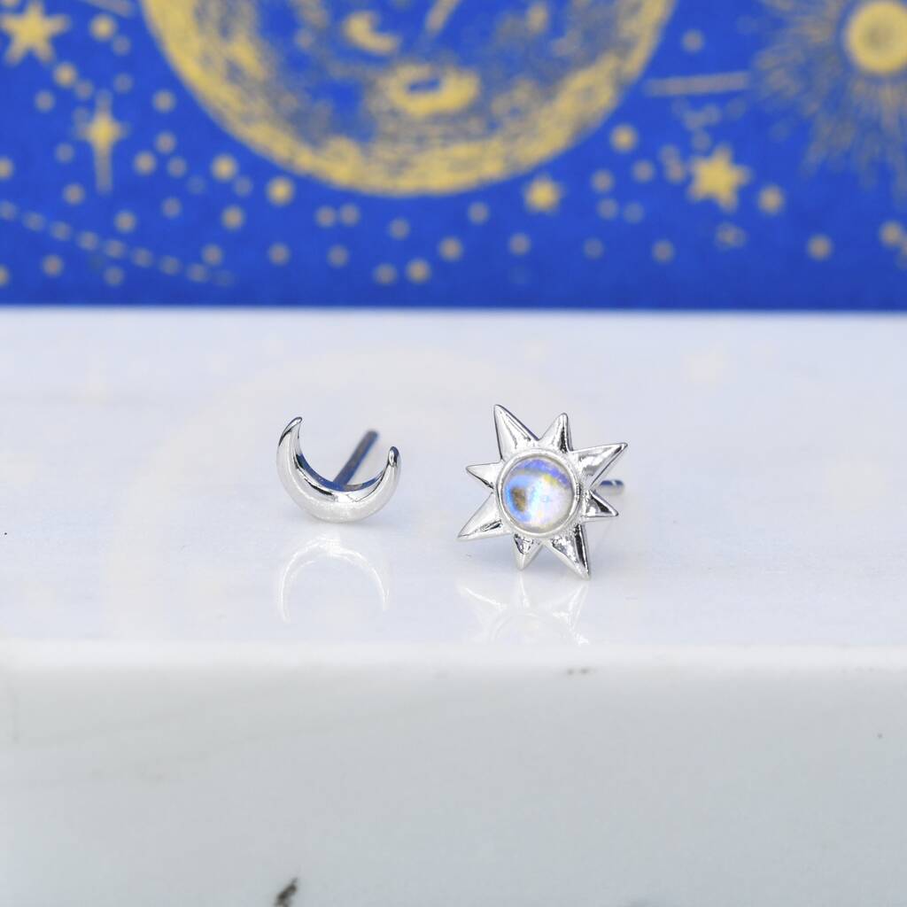 Mismatched Starburst And Moon Stud Earrings In Sterling Silver With Lab Moonstone
