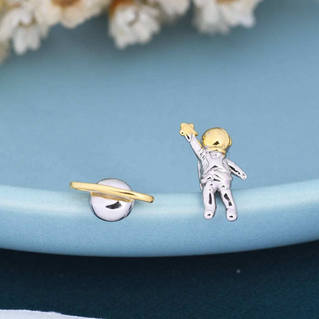 Mismatched Tiny Astronaut And Planet Stud Earrings In Sterling Silver