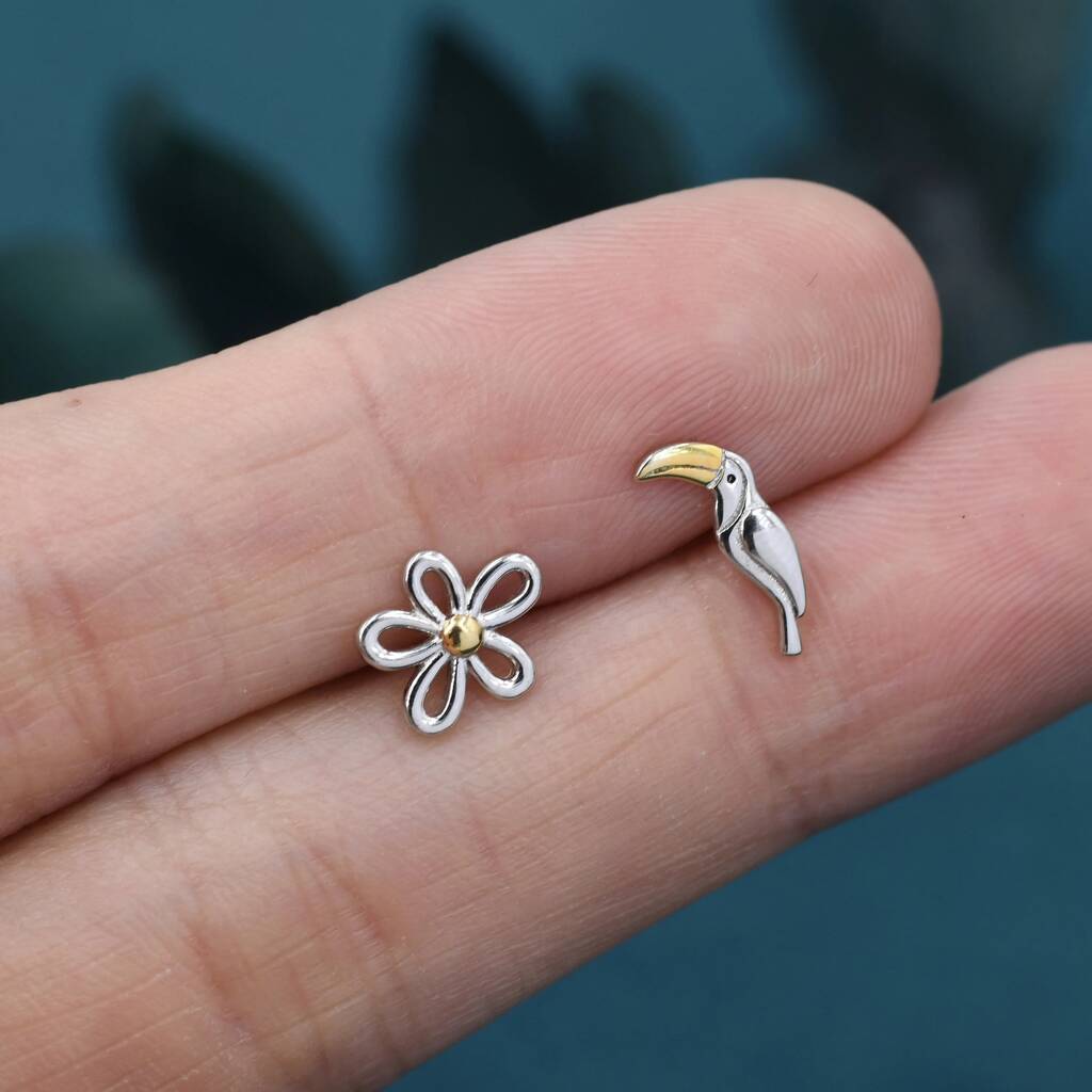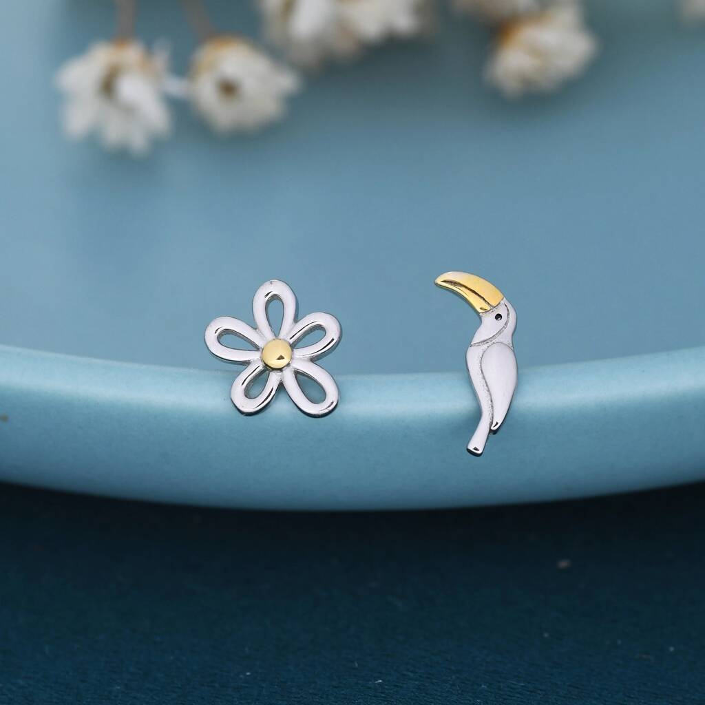 Mismatched Toucan and Flower Stud Earrings in Sterling Silver — vibrant tropical-inspired pair, adding playful color and whimsical charm to your everyday jewelry collection.