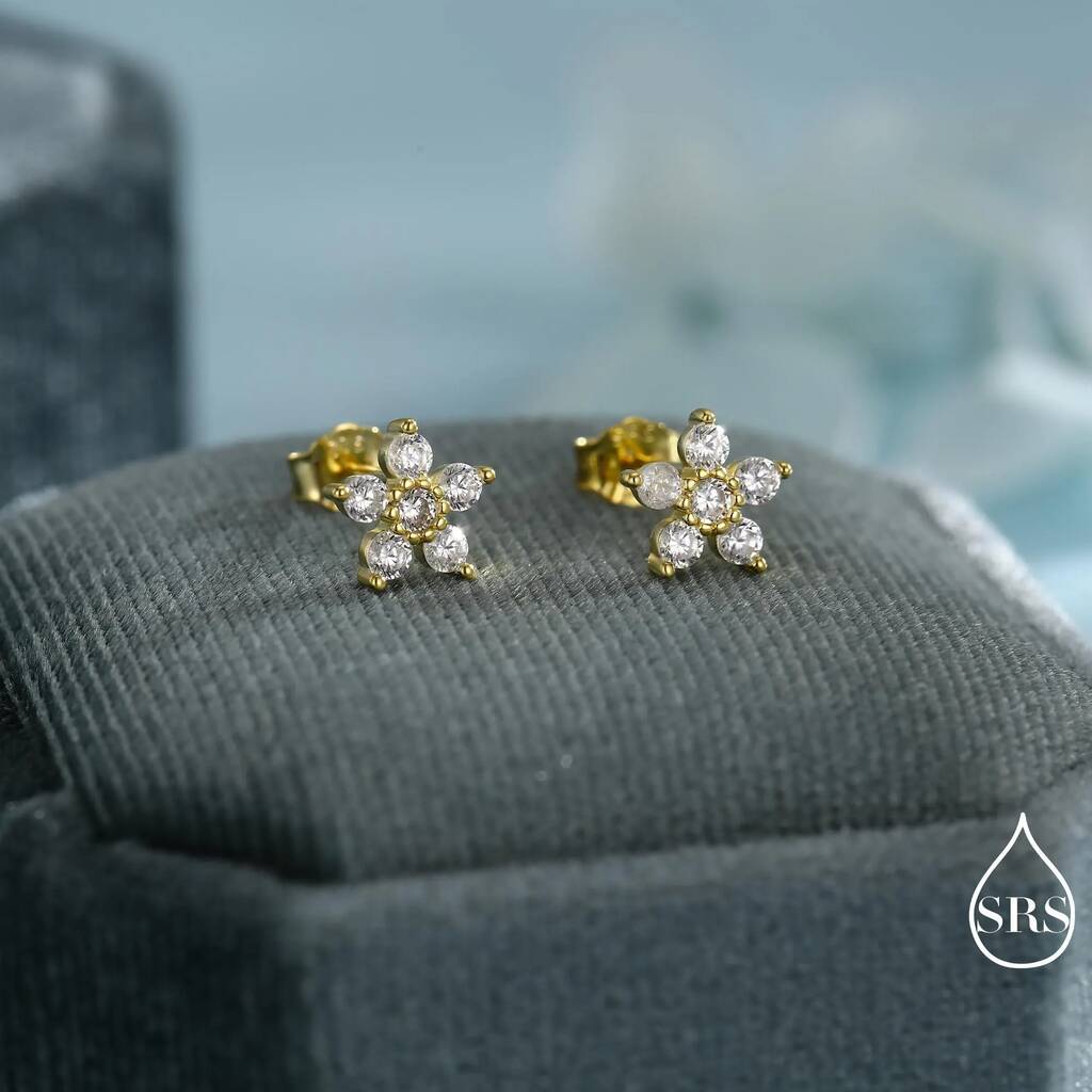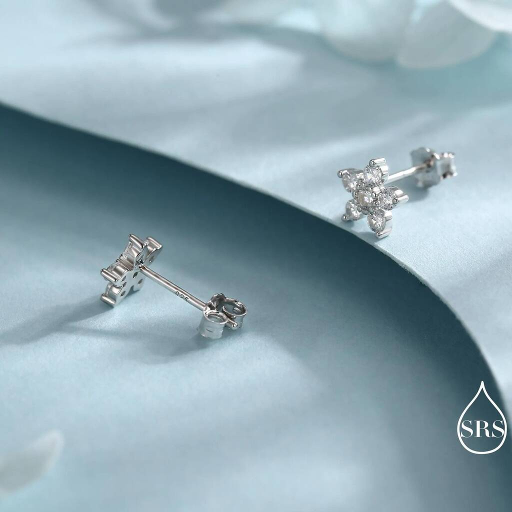 Sparkly Forget Me Not Flower Tiny Stud Earrings In Sterling Silver With Cz Crystals