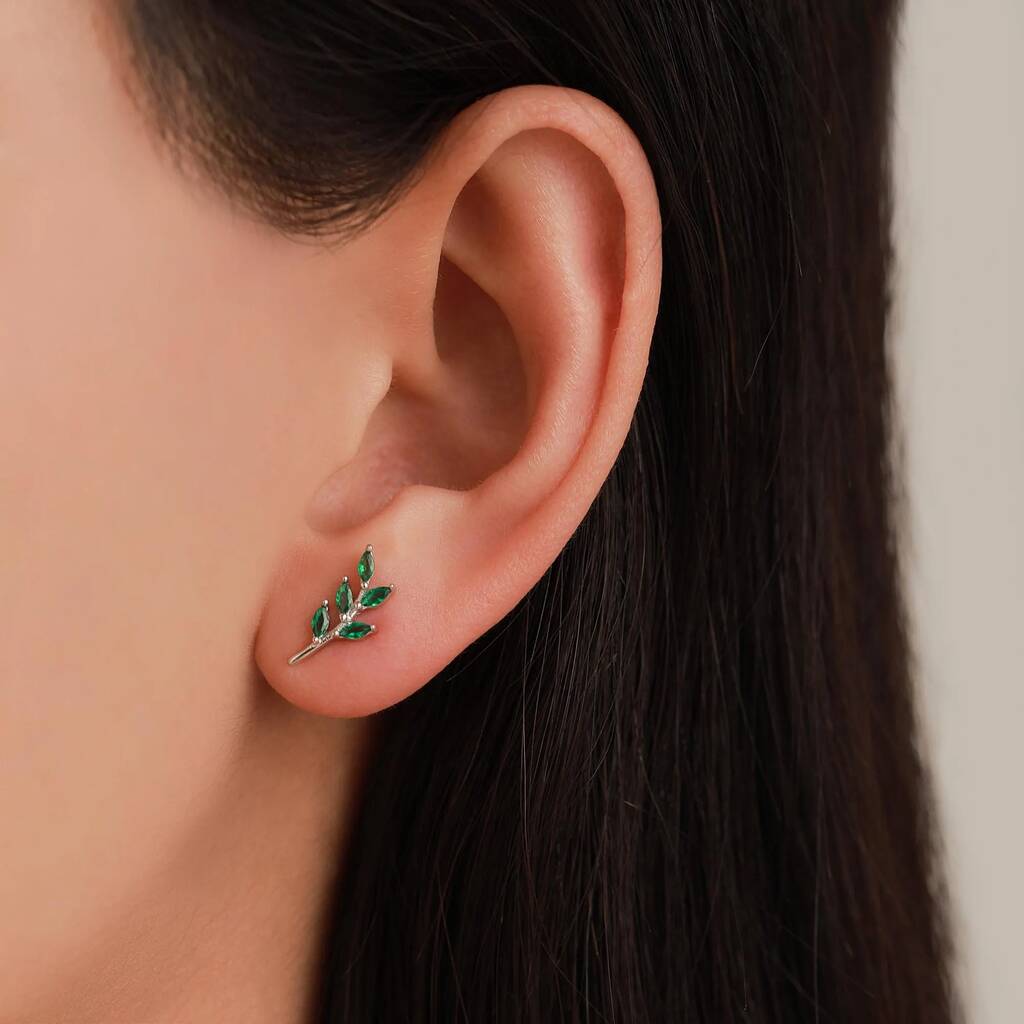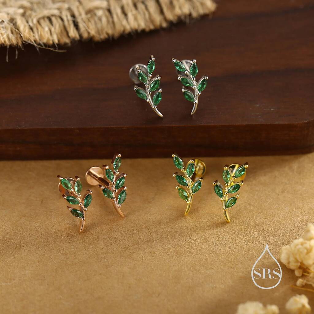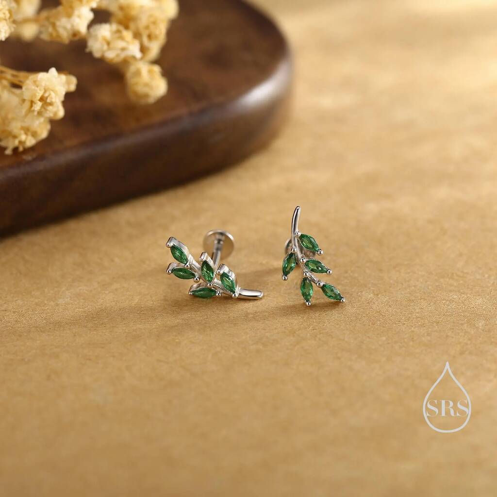 Sterling Silver Emerald Green Leaf Internally Threaded Flat Back Earrings