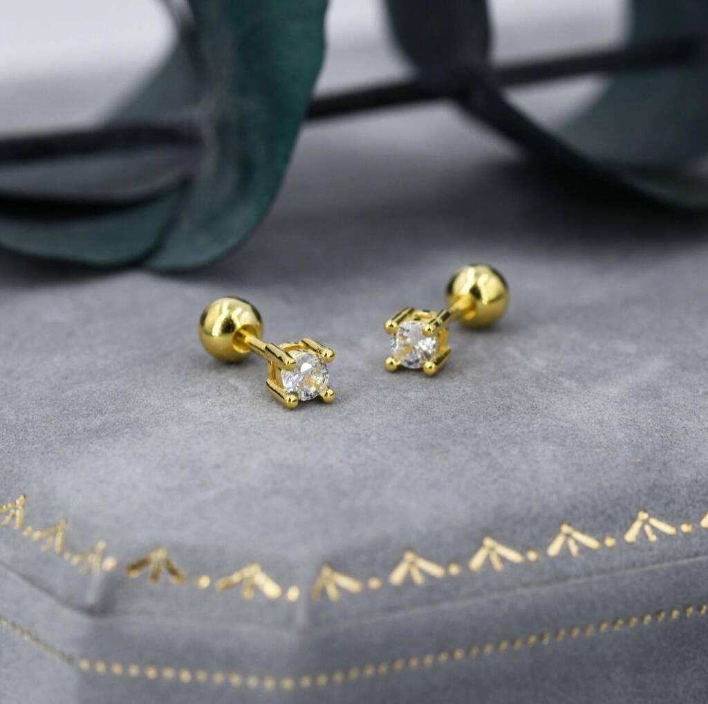 Sterling silver studs with four-prong CZ stones and secure screw backs, adding sparkling elegance, subtle sophistication, and a refined, stylish touch to everyday-wear or gifting.