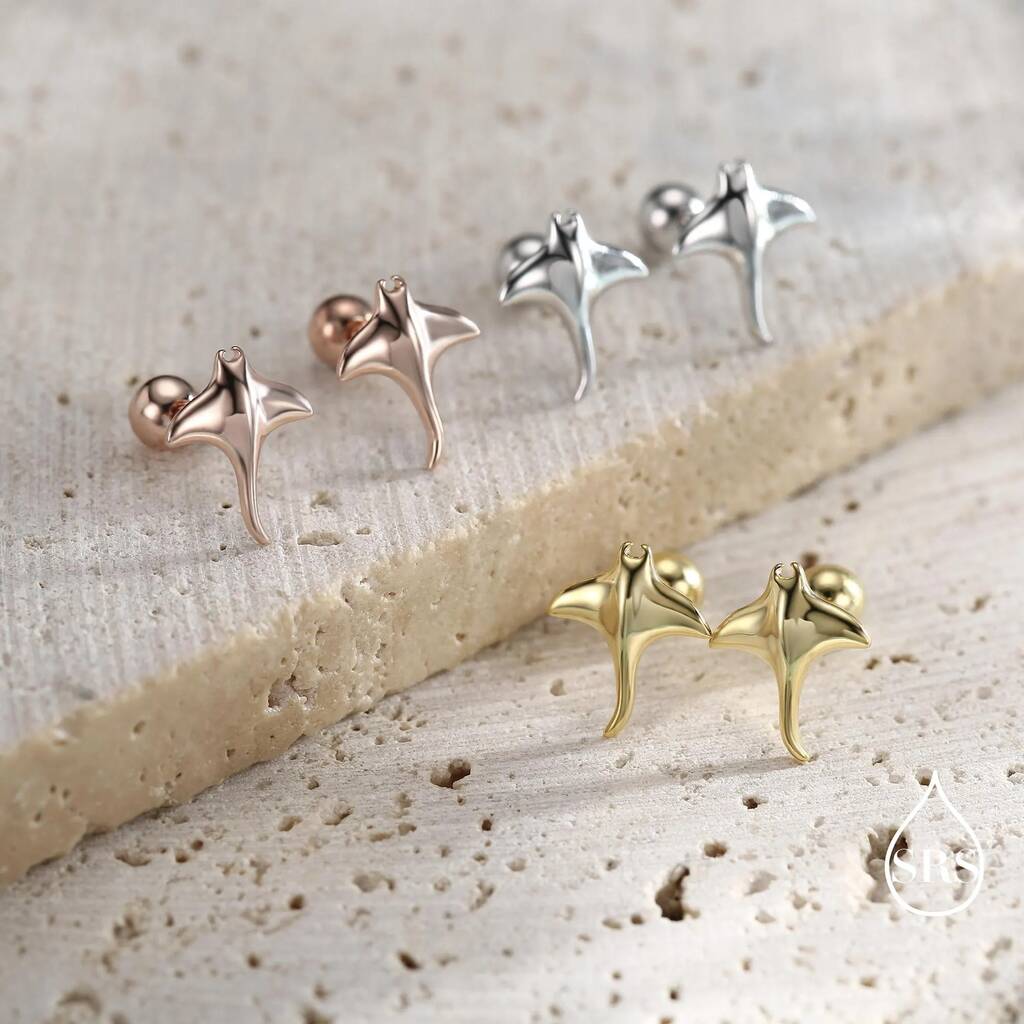 • Sterling Silver Manta Ray Screw Back Earrings, thumbnail 1 of 10
