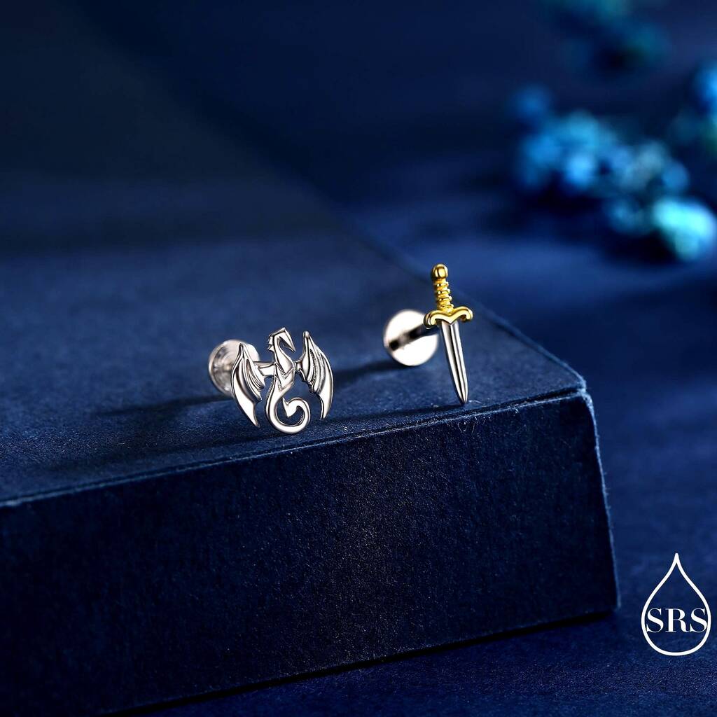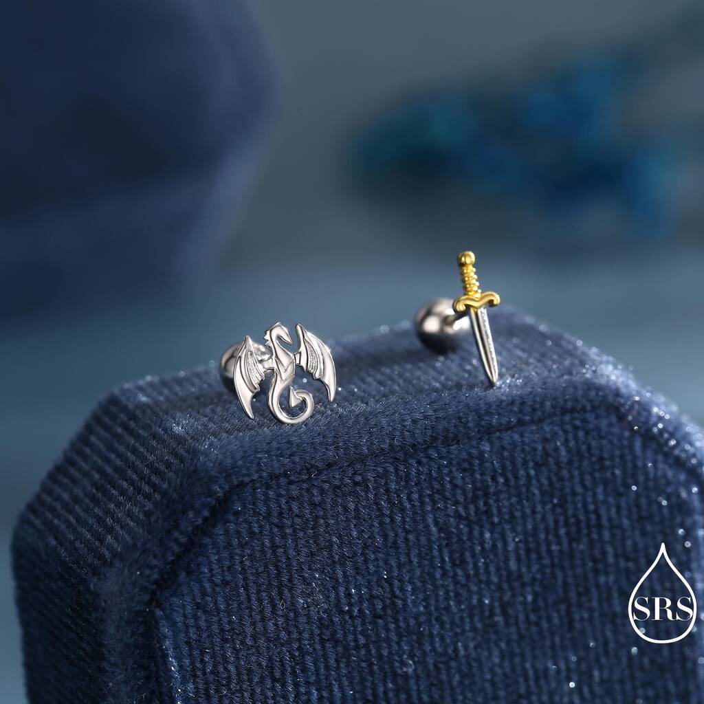 Embrace a bold-look with our Sterling-Silver Mismatched Dragon and Sword Stud-Earrings. These earrings bring a touch of fantasy-inspired-style, perfect for adding a unique-accent to any-outfit.