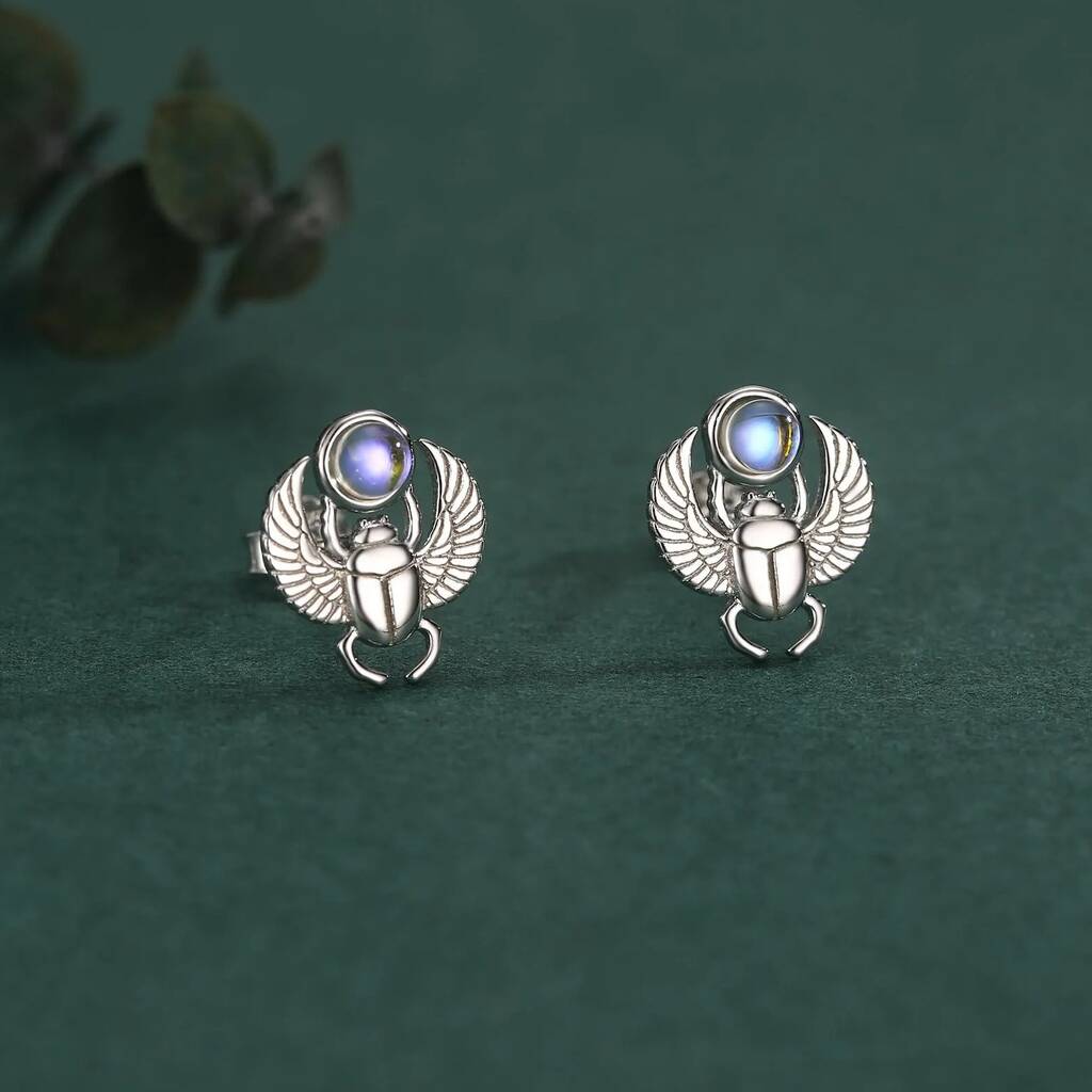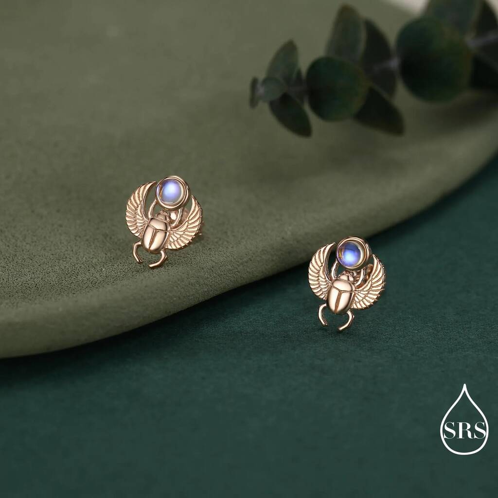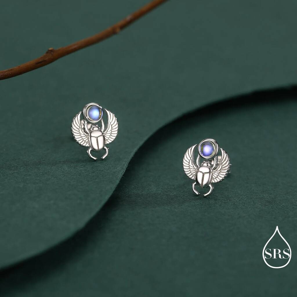 Sterling silver studs featuring detailed scarab beetle designs set with lab moonstone, adding mystical charm, iridescent-glow, and a unique, stylish touch to everyday-wear or gifting.