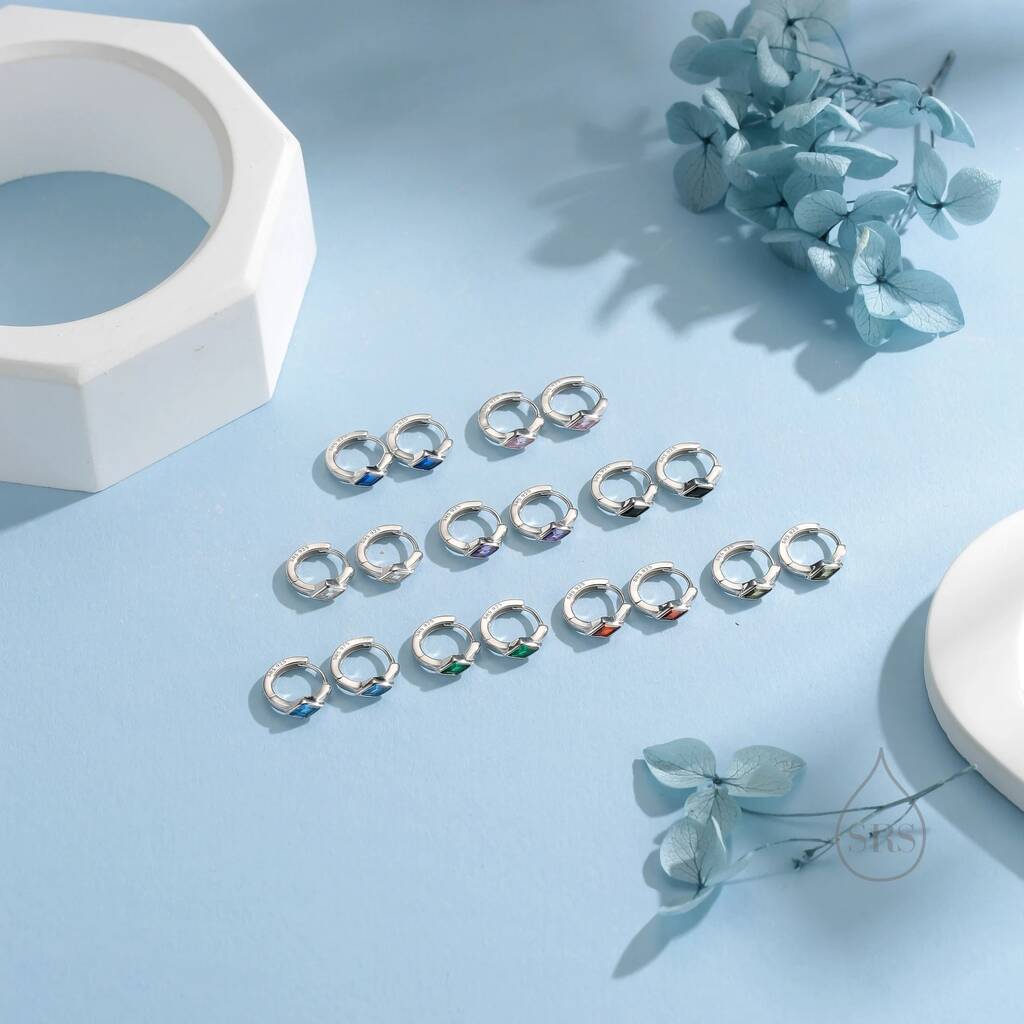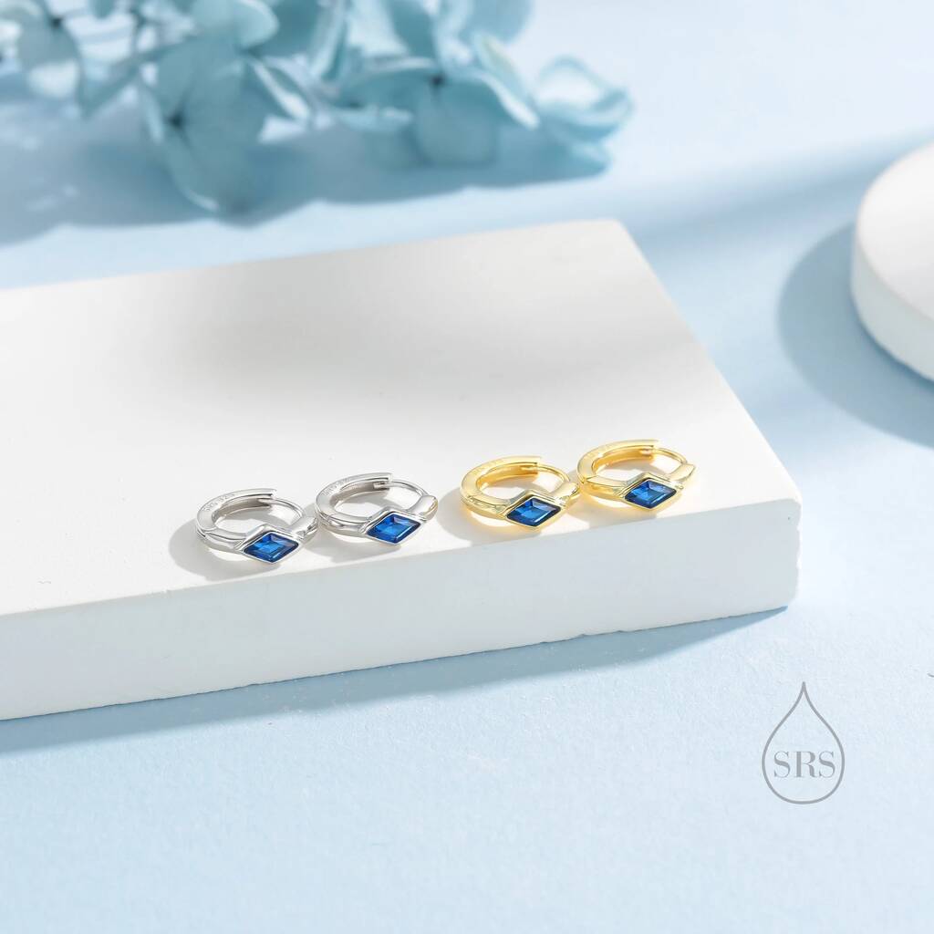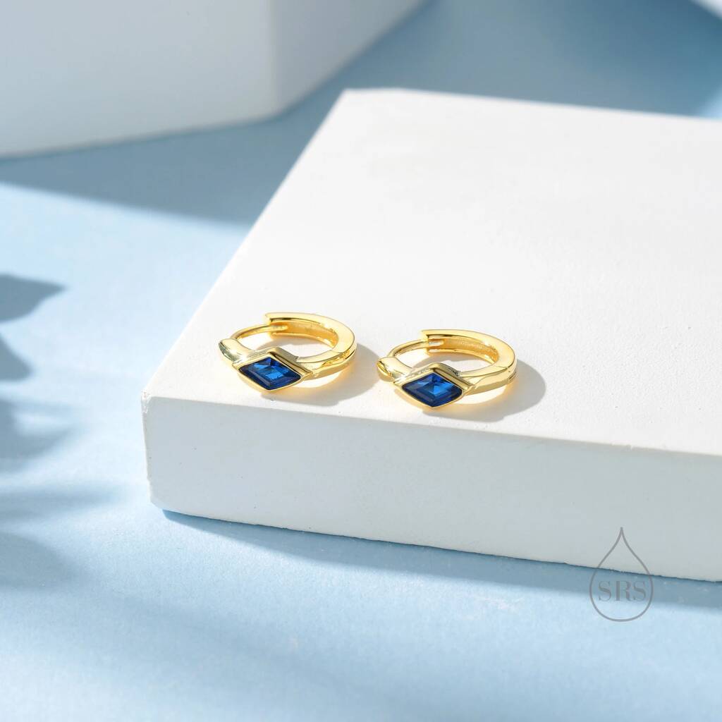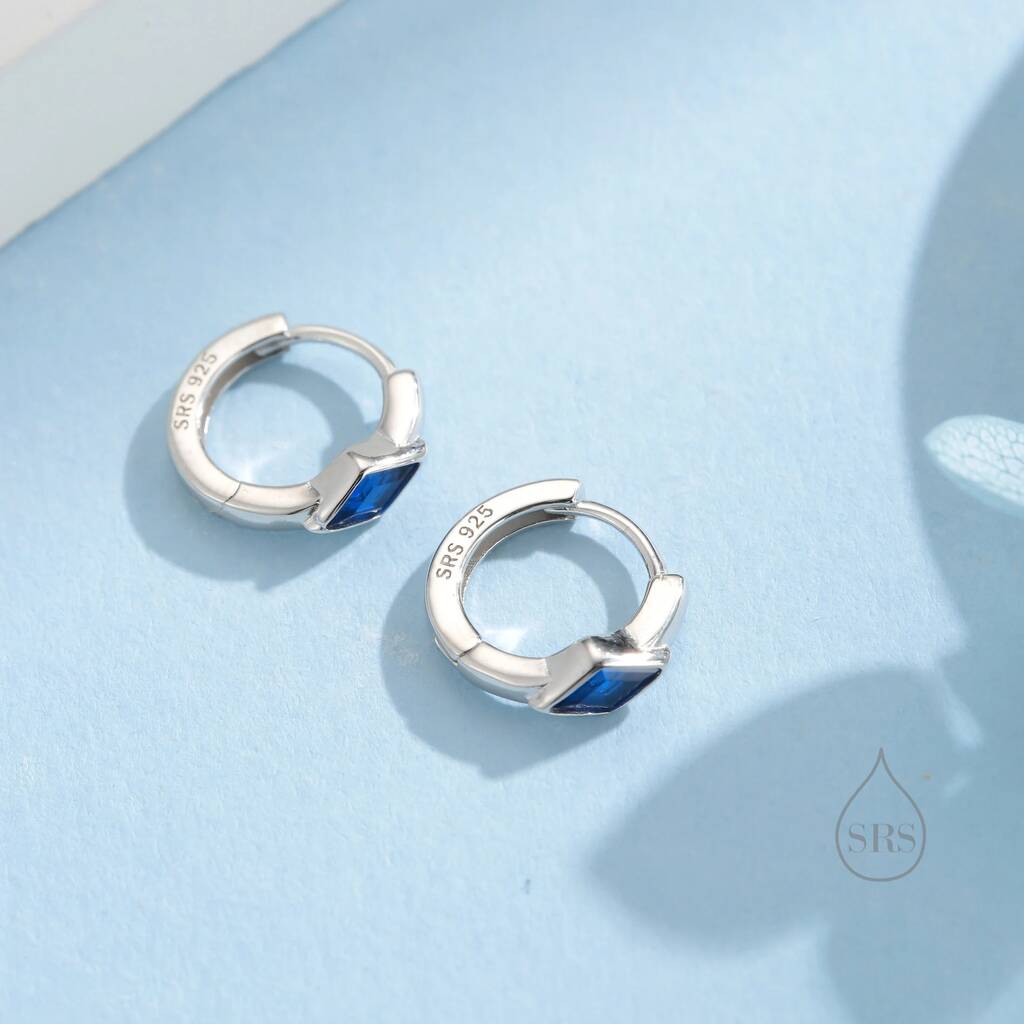 Tiny Rhombus Sapphire Blue Cz Huggie Hoop In Sterling Silver