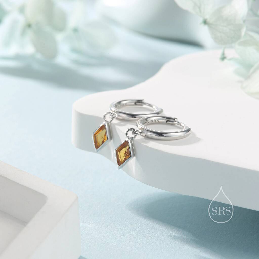 Very Tiny Rhombus Citrine Yellow Cz Huggie Hoop In Sterling Silver