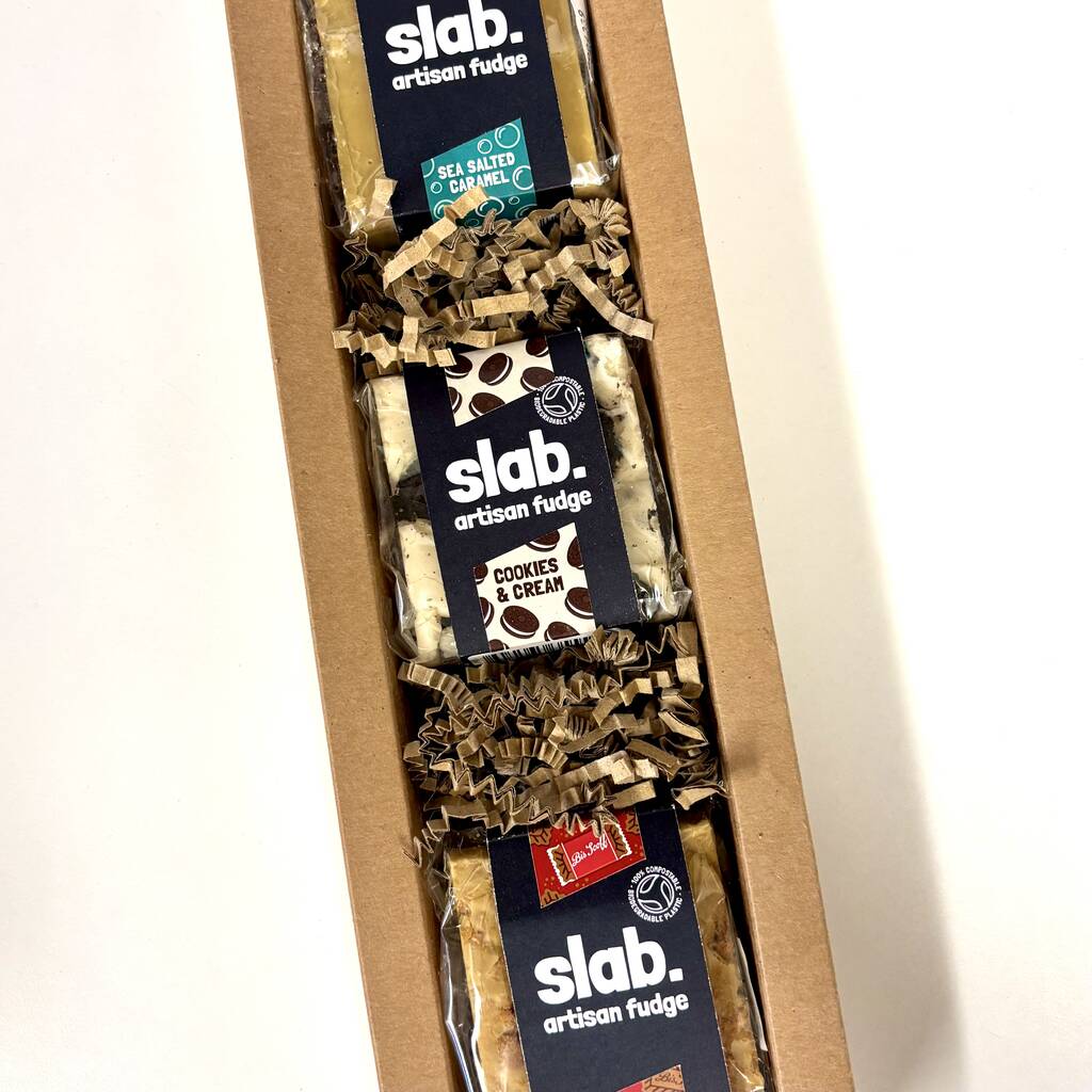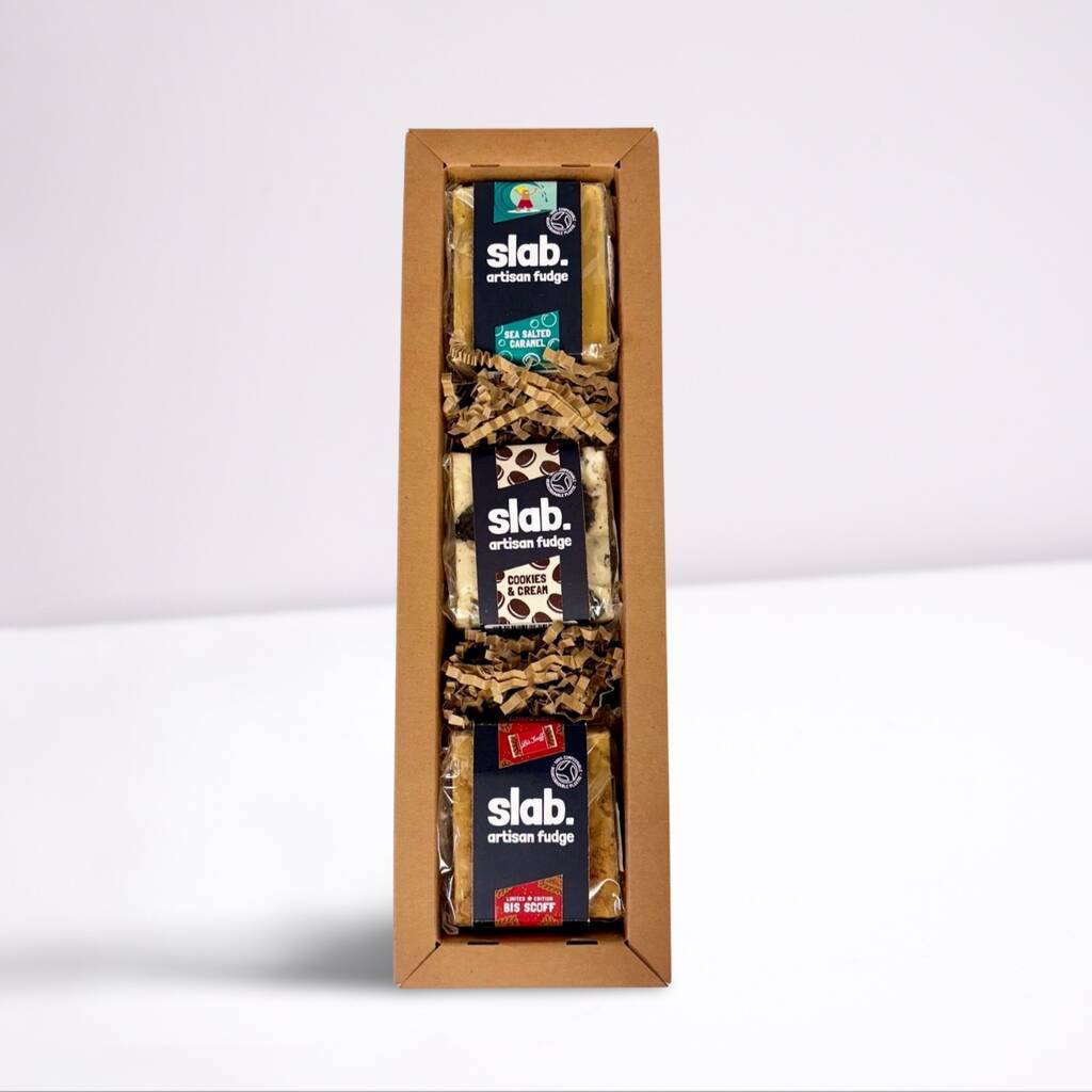 Our 3 best-selling flavours all in one box!The Slab Bestsellers Selection Box contains our 3 most popular fudge flavours - Sea-Salted Caramel, Bis Scoff and Cookies & Cream. They’re popular for a reason! All freshly made and wrapped by hand, as always. The perfect gift for someone who’s got everything!