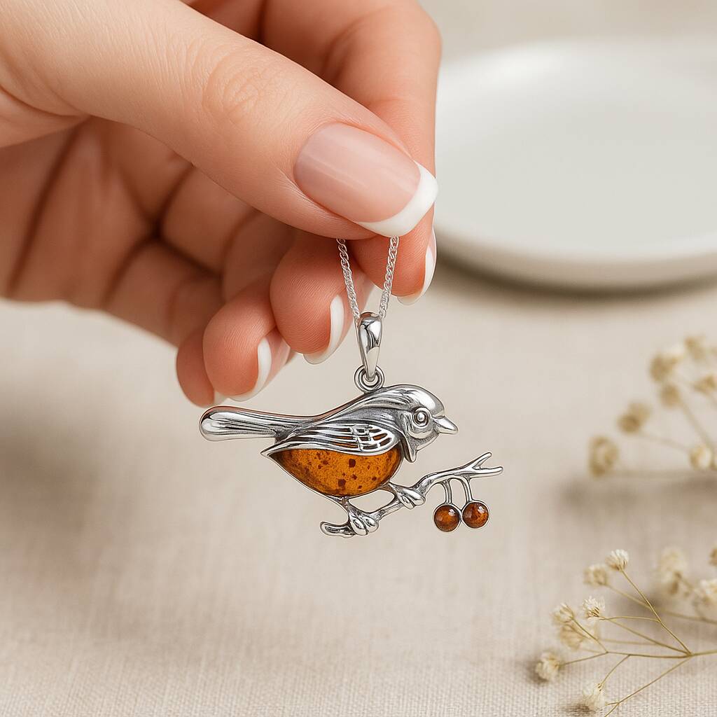 Personalised Sterling Silver Baltic Amber Robin Pendant Necklace