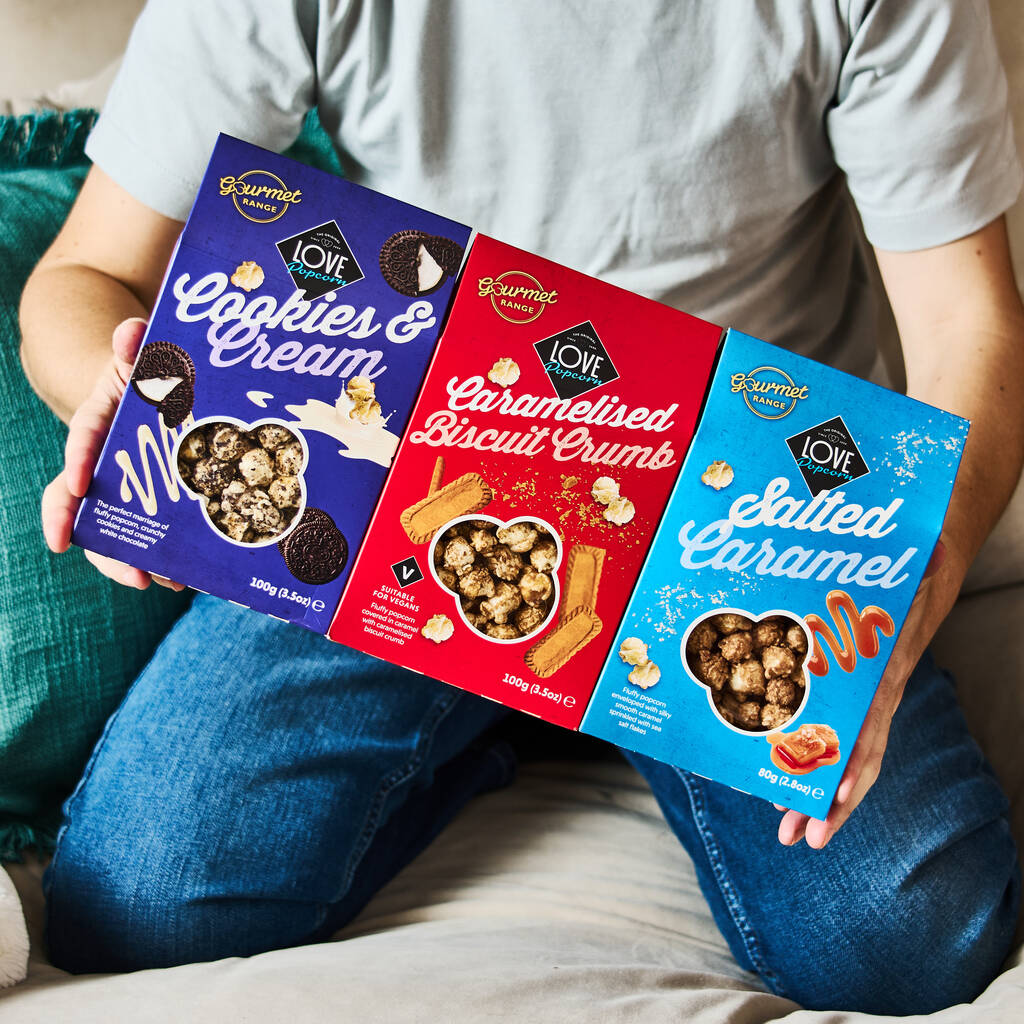 Caramelised Biscuit Crumb - Gourmet Popcorn Box Ingredients: Wheat Flour, Sugar, Vegetable Oils (Palm Oil fromsustainable and certified plantations, Rapeseed Oil), CandySugar Syrup, Raising Agent (Sodium Hydrogen Carbonate),Soya Flour, Salt, Cinnamon], Sugar, Golden Syrup, Coconut Oil,Glucose Syrup, Ground Cinnamon, Rapeseed Oil, Baking Soda,Salt, Flavouring, Lecithin Powder/Granules (Soya).