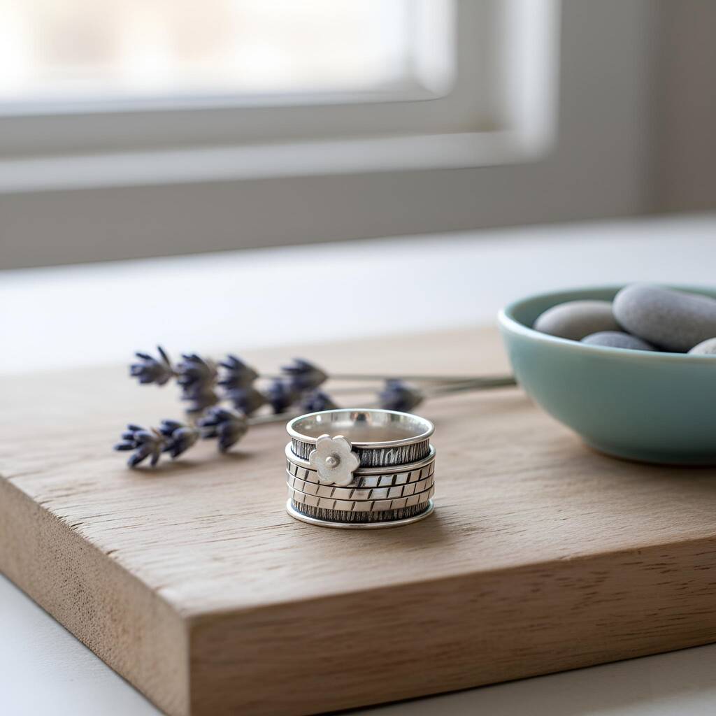 Handmade Sterling Silver Daisy Spinner Ring – Wide Hammered Band