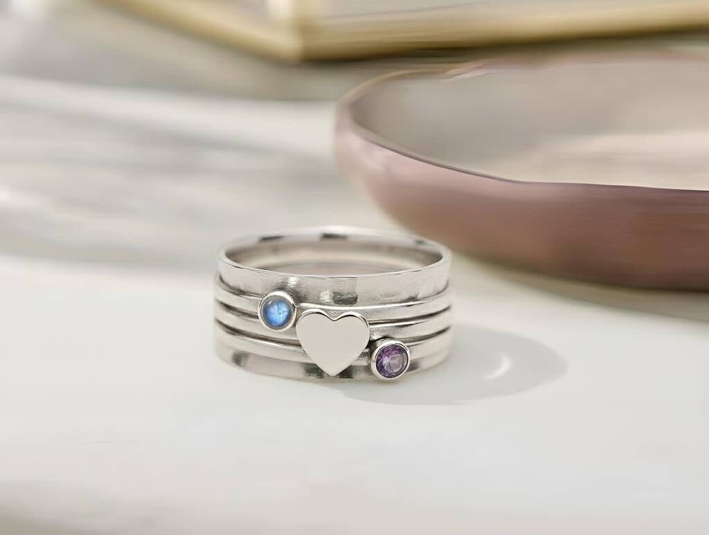 Sterling Silver Amethyst And Rainbow Moonstone Worry Ring – Wide Hammered Spinner Band