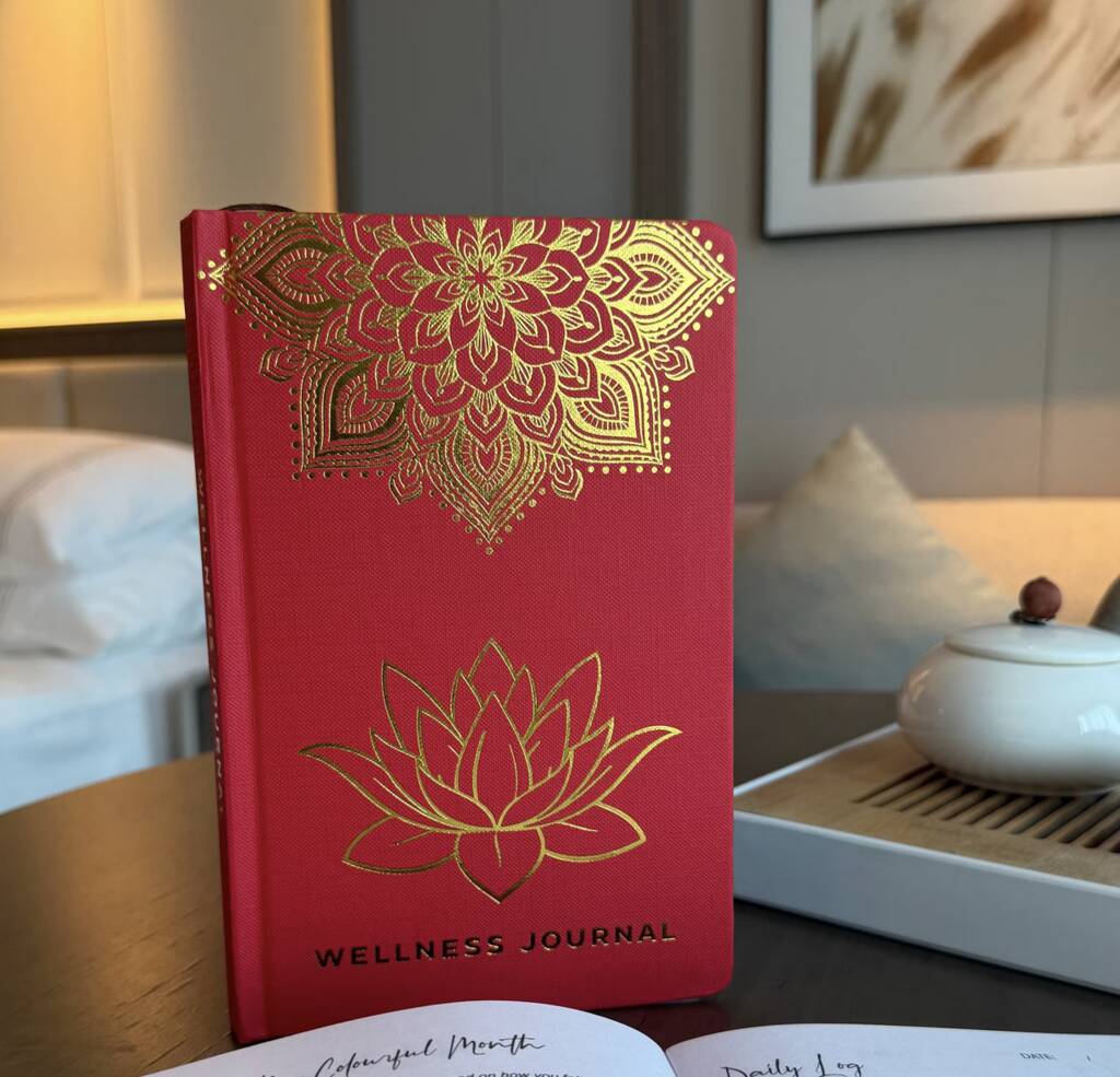 Bring balance and energy to your daily routine with this striking Red Wellness Journal, featuring a radiant golden mandala and lotus design. With 120 guided pages, it encourages mindful reflection through mood tracking, energy charts, and daily wellness logs.