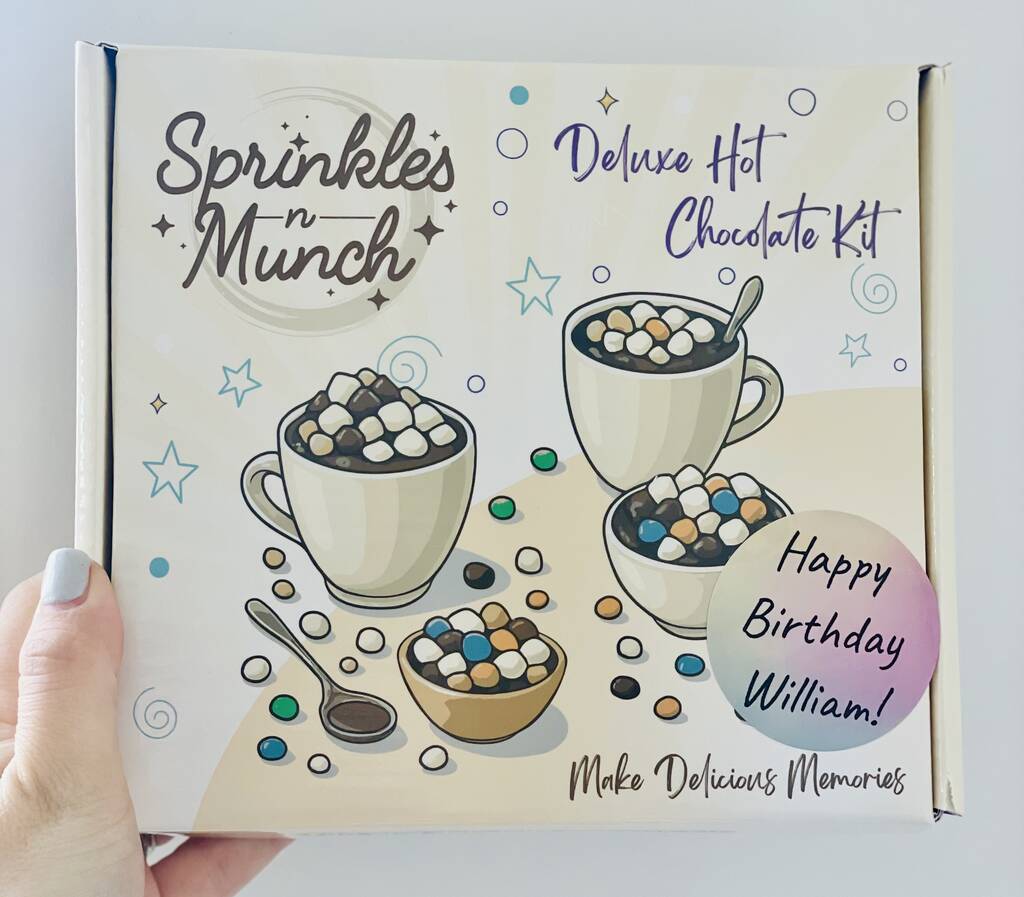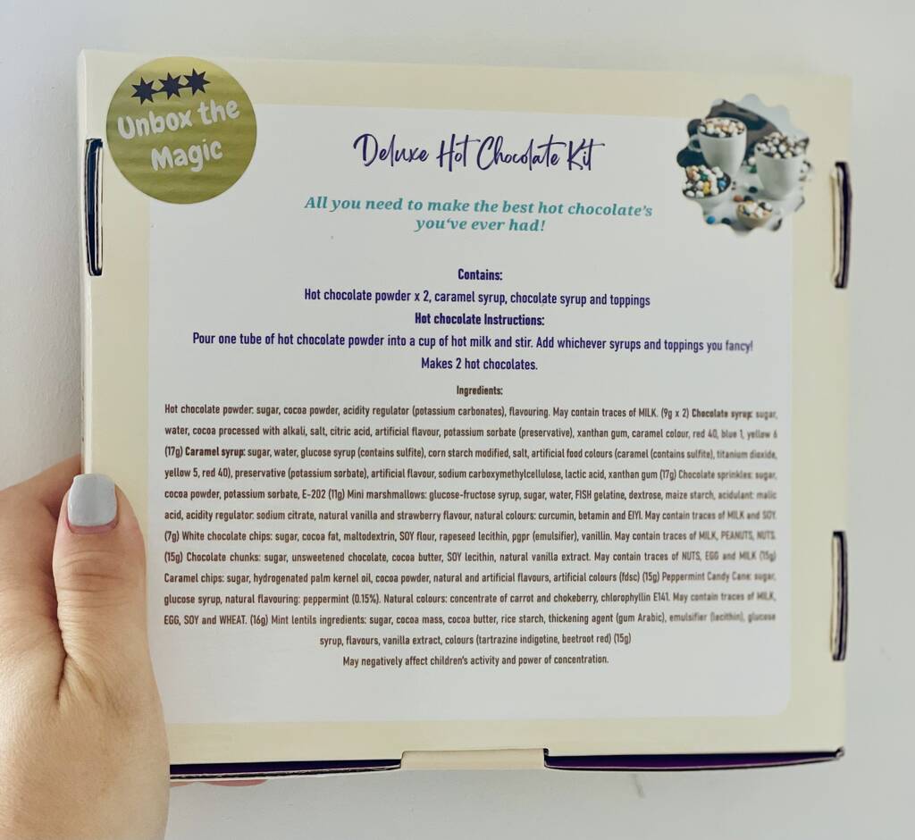 Hot chocolate powder: sugar, cocoa powder, acidity regulator (potassium carbonates), flavouring. May contain traces of MILK. (9g x 2) Chocolate syrup: sugar, water, cocoa processed with alkali, salt, citric acid, artificial flavour, potassium sorbate (preservative), xanthan gum, caramel colour, red 40, blue 1, yellow 6 (17g) Caramel syrup: sugar, water, glucose syrup (contains sulfite), corn starch modified, salt, artificial food colours (caramel (contains sulfite), titanium dioxide, yellow 5, red 40), preservative (potassium sorbate), artificial flavour, sodium carboxymethylcellulose, lactic acid, xanthan gum (17g) Chocolate sprinkles: sugar, cocoa powder, potassium sorbate, E-202 (11g) Mini marshmallows: glucose-fructose syrup, sugar, water, FISH gelatine, dextrose, maize starch, acidulant: malic acid, acidity regulator: sodium citrate, natural vanilla and strawberry flavour, natural colours: curcumin, betamin and E141. May contain traces of MILK and SOY. (7g) White chocolate chips: sugar, cocoa fat, maltodextrin, SOY flour, rapeseed lecithin, pgpr (emulsifier), vanillin. May contain traces of MILK, PEANUTS, NUTS. (15g) Chocolate chunks: sugar, unsweetened chocolate, cocoa butter, SOY lecithin, natural vanilla extract. May contain traces of NUTS, EGG and MILK (15g) Caramel chips: sugar, hydrogenated palm kernel oil, cocoa powder, natural and artificial flavours, artificial colours (fd&c) (15g) Peppermint Candy Cane: sugar, glucose syrup, natural flavouring: peppermint (0.15%). Natural colours: concentrate of carrot and chokeberry, chlorophyllin E141. May contain traces of MILK, EGG, SOY and WHEAT. (16g) Mint lentils ingredients: sugar, cocoa mass, cocoa butter, rice starch, thickening agent (gum Arabic), emulsifier (lecithin), glucose syrup, flavours, vanilla extract, colours (tartrazine indigotine, beetroot red) (15g) May negatively affect children’s activity and power of concentration.
