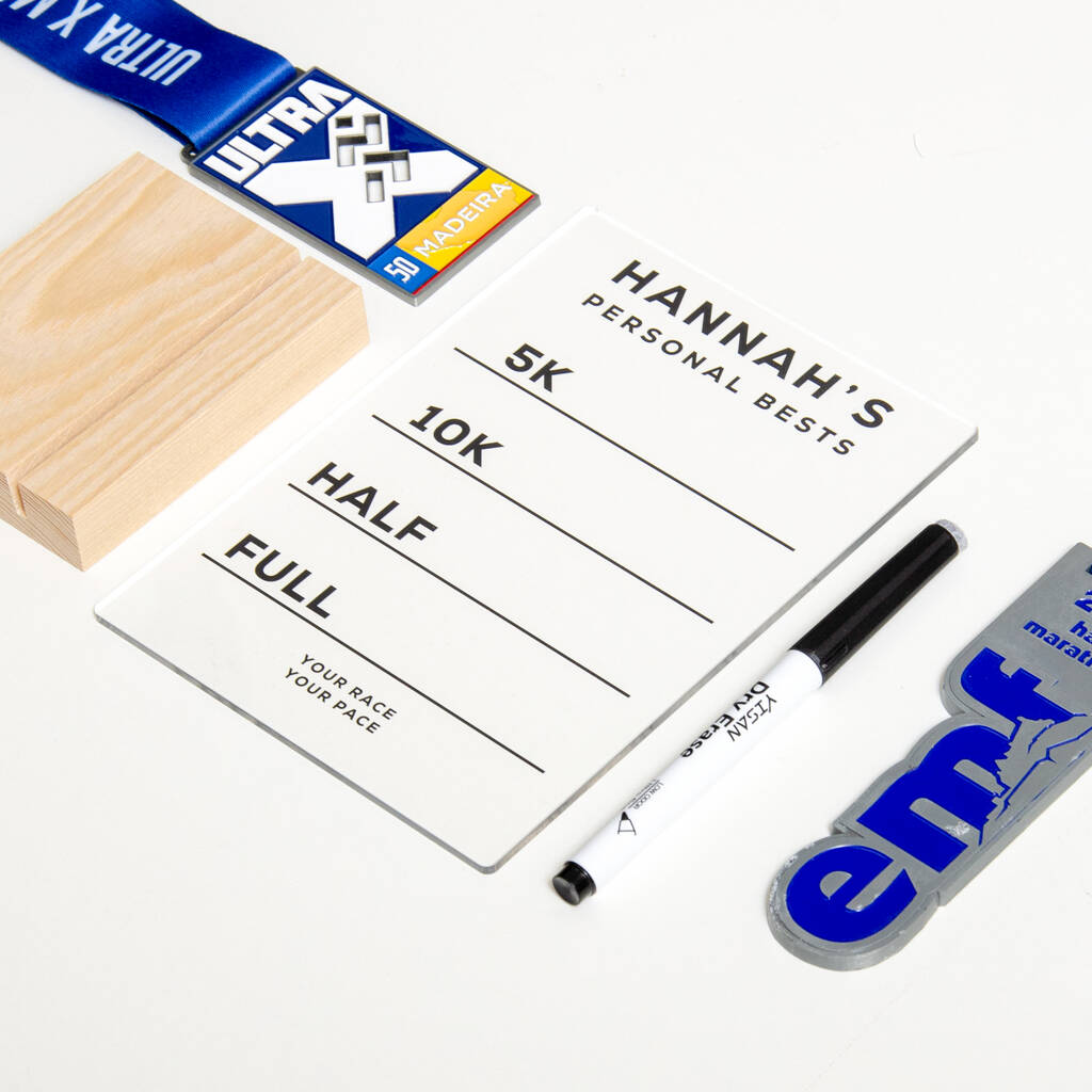 A stylish and fun way to keep a record of your personal best times for 5 km, 10km, half marathon and full marathon.