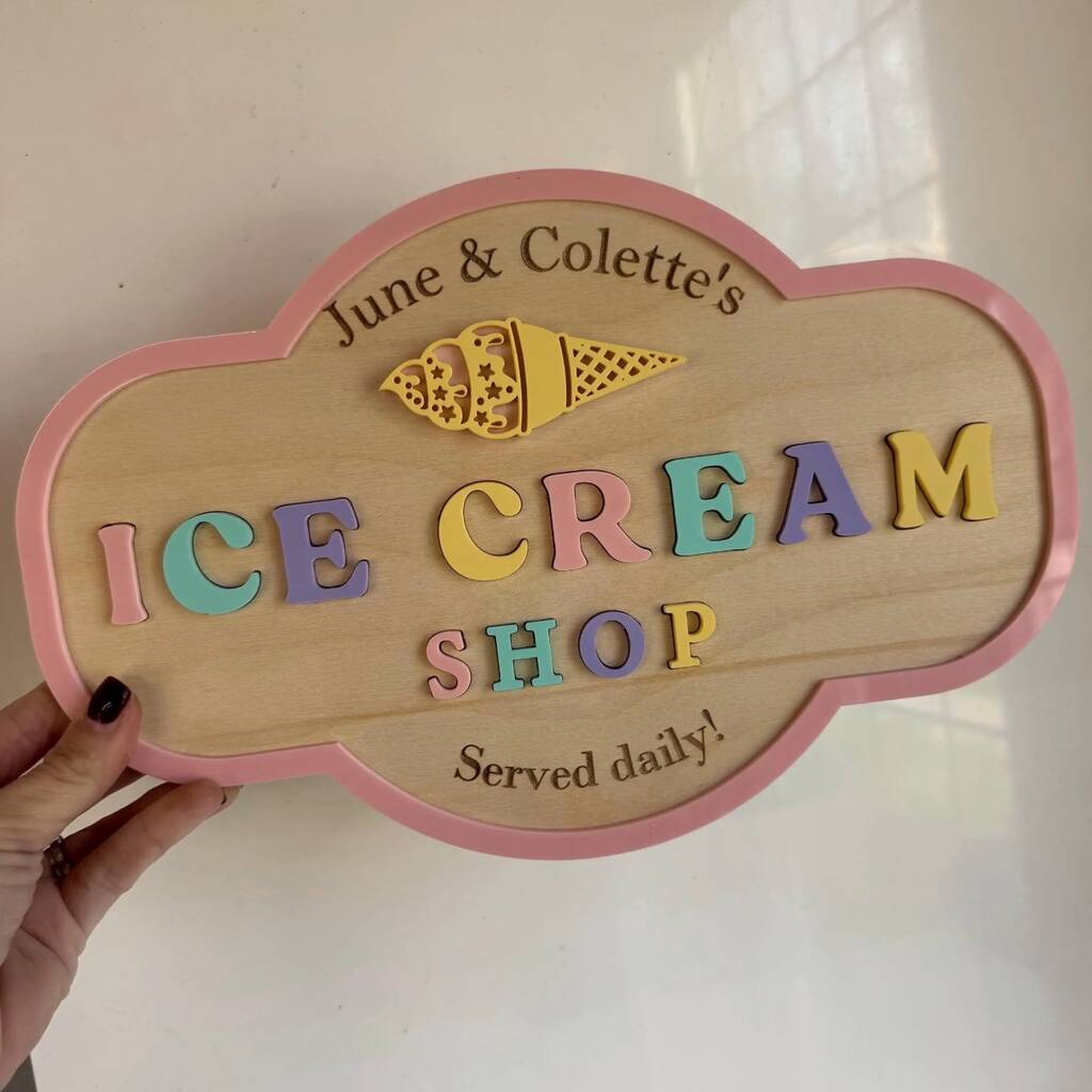 Make playtime extra sweet with this personalised kids ice cream shop sign the perfect addition to any pretend play space.Custom Wooden Ice Cream Shop Sign – Personalised Playroom & Pretend Play Décor for Kids!