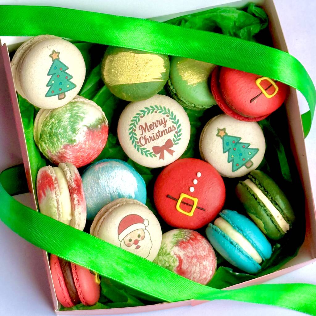 A gift box of Christmas macarons featuring hand-decorated festive designs and flavours.