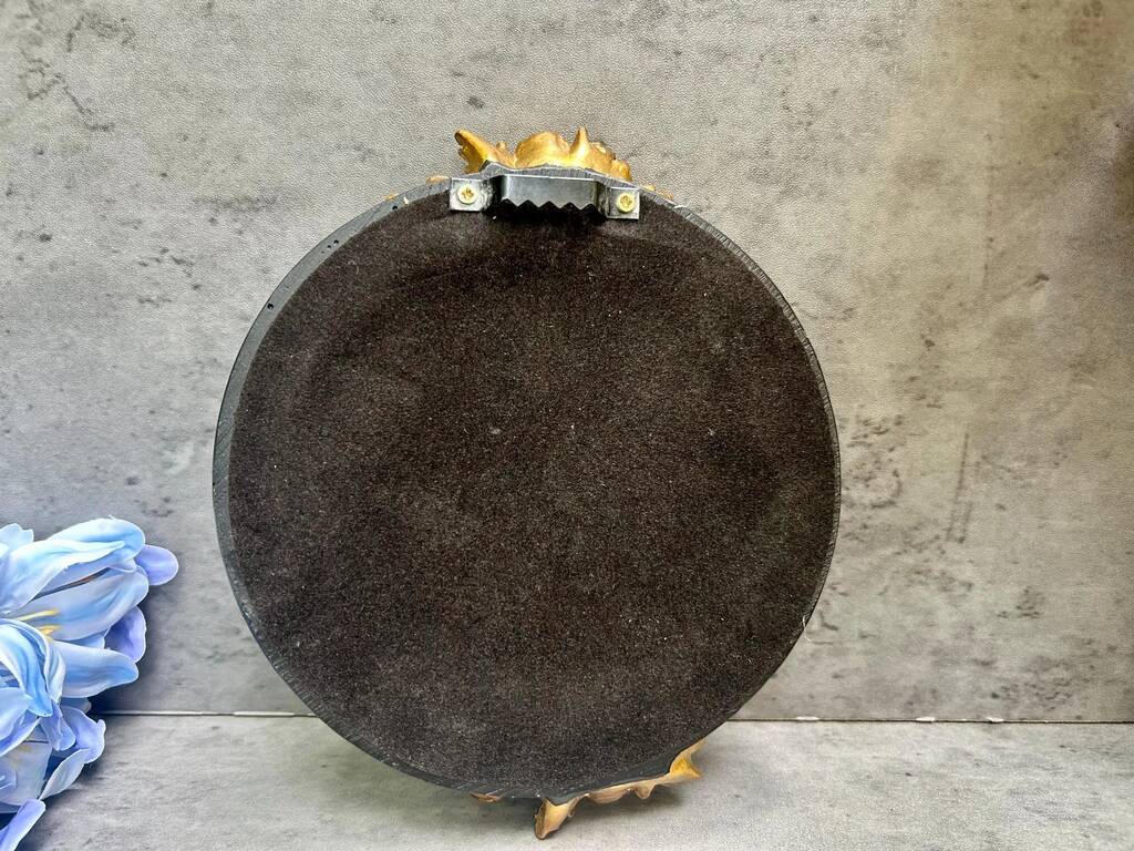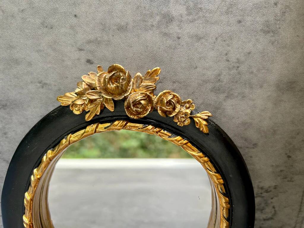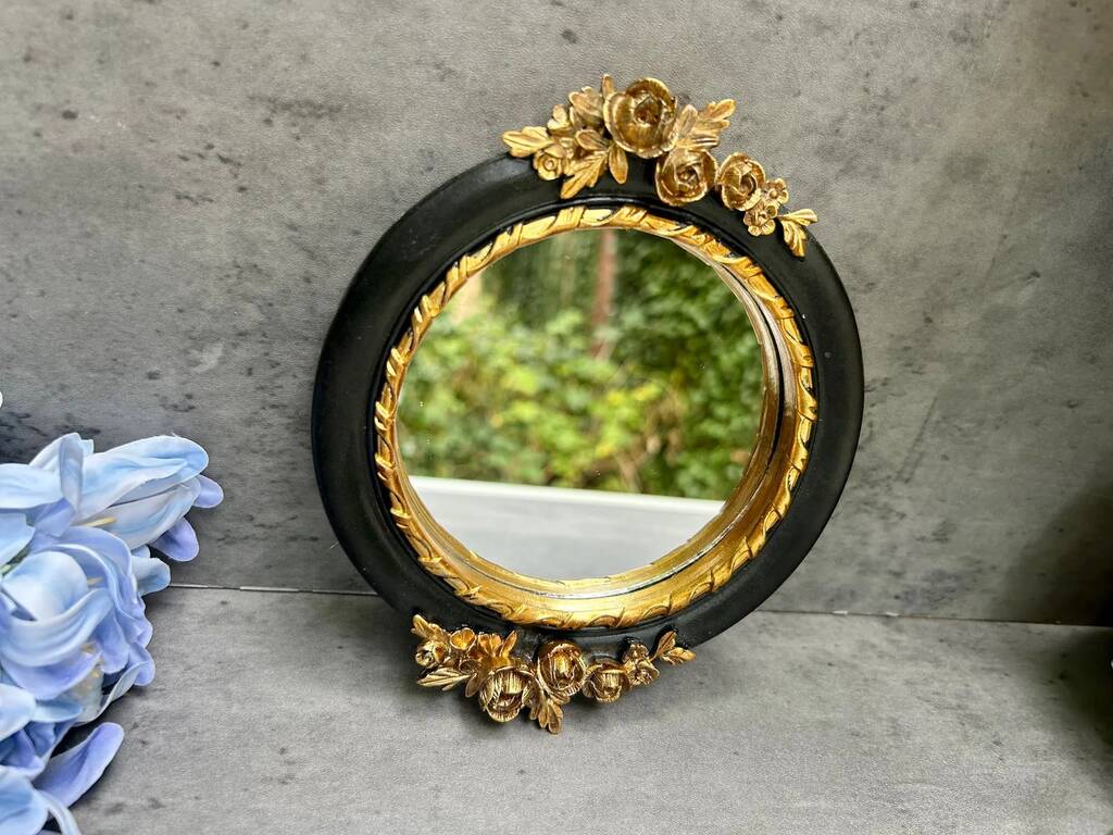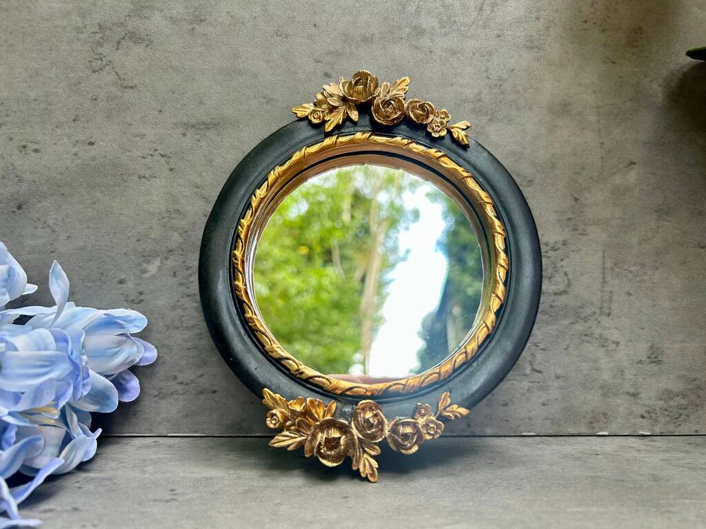 16cm Round Wall Mirror Black Frame With Gold Flower Detail