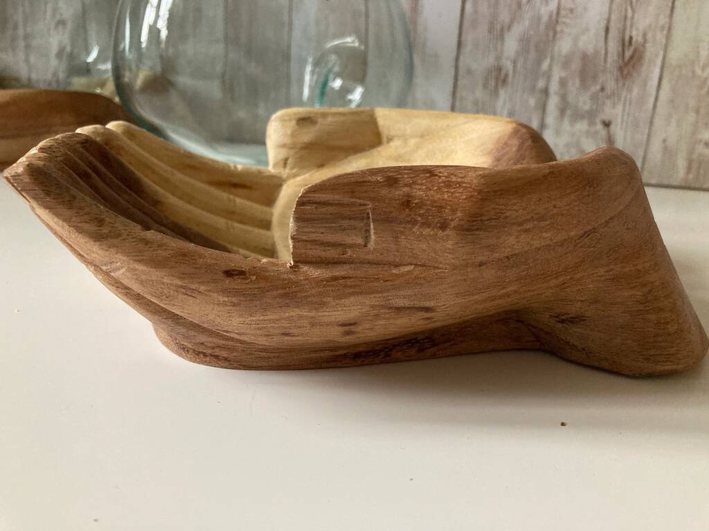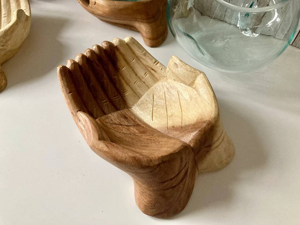 This stunning piece of table art is made from teak root and hand-carved in Bali, Indonesia in the shape of a pair of hands.