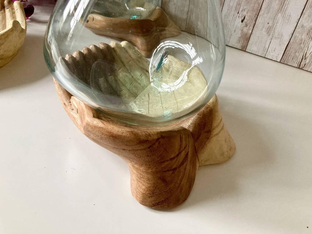 Whilst the glass is hot it is relaxed ove the hands to that when it hardens it fits to the shape of the hands ensuring a perfect fit.