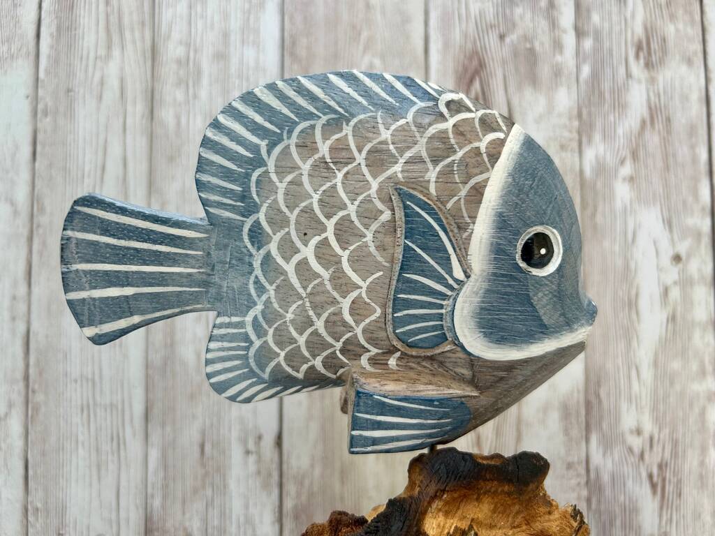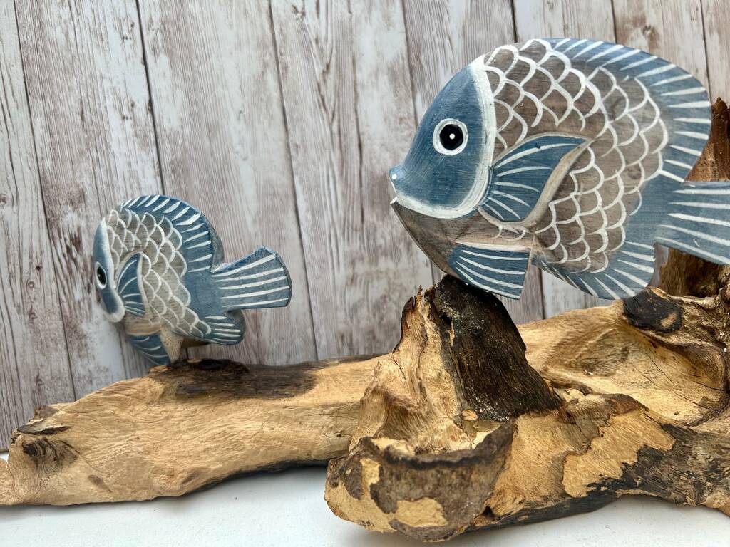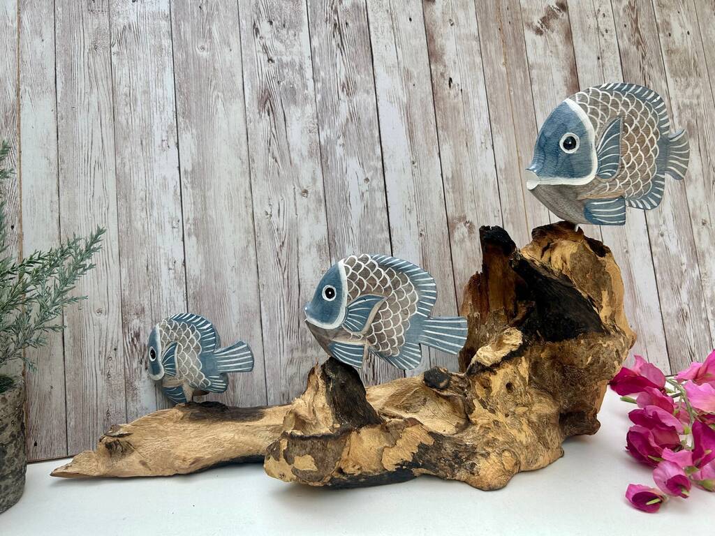 48cm Hand Carved Coral And Blue Fish Figurine On Teak Root Ornament