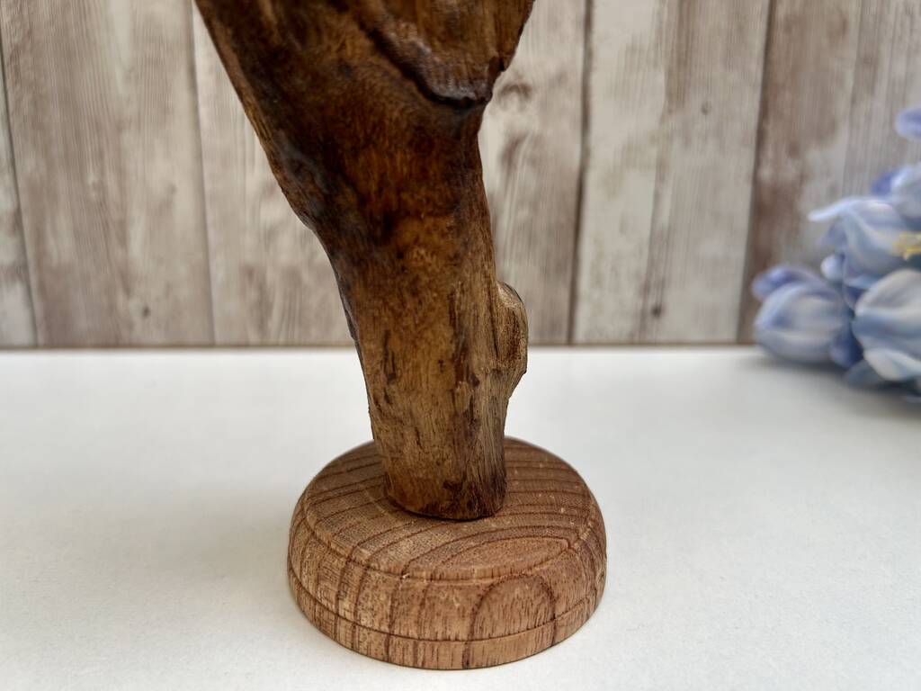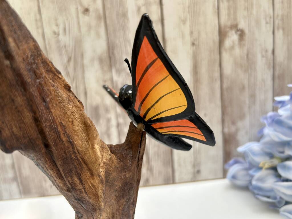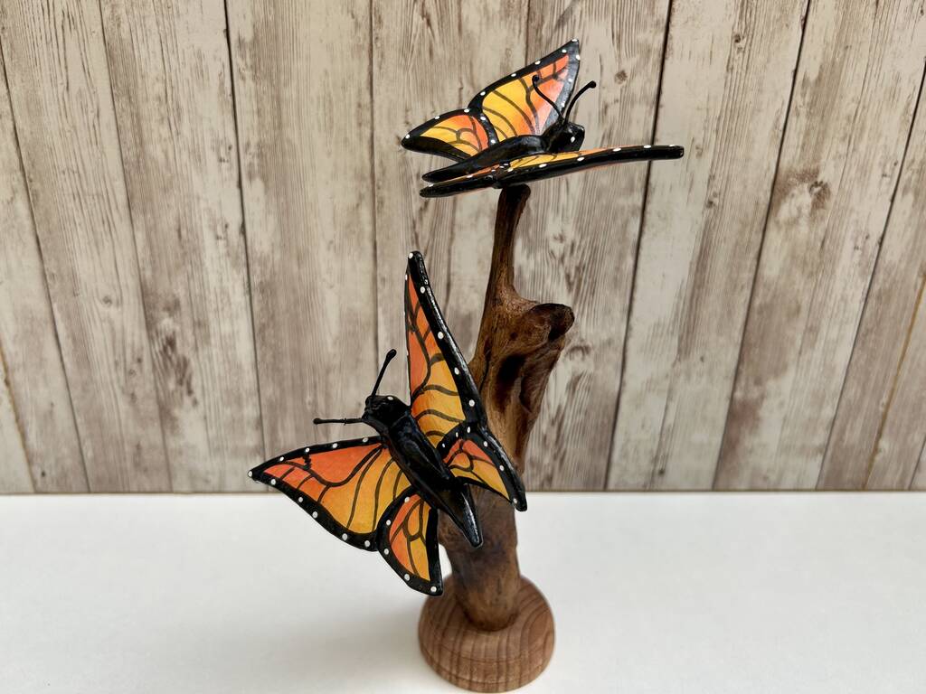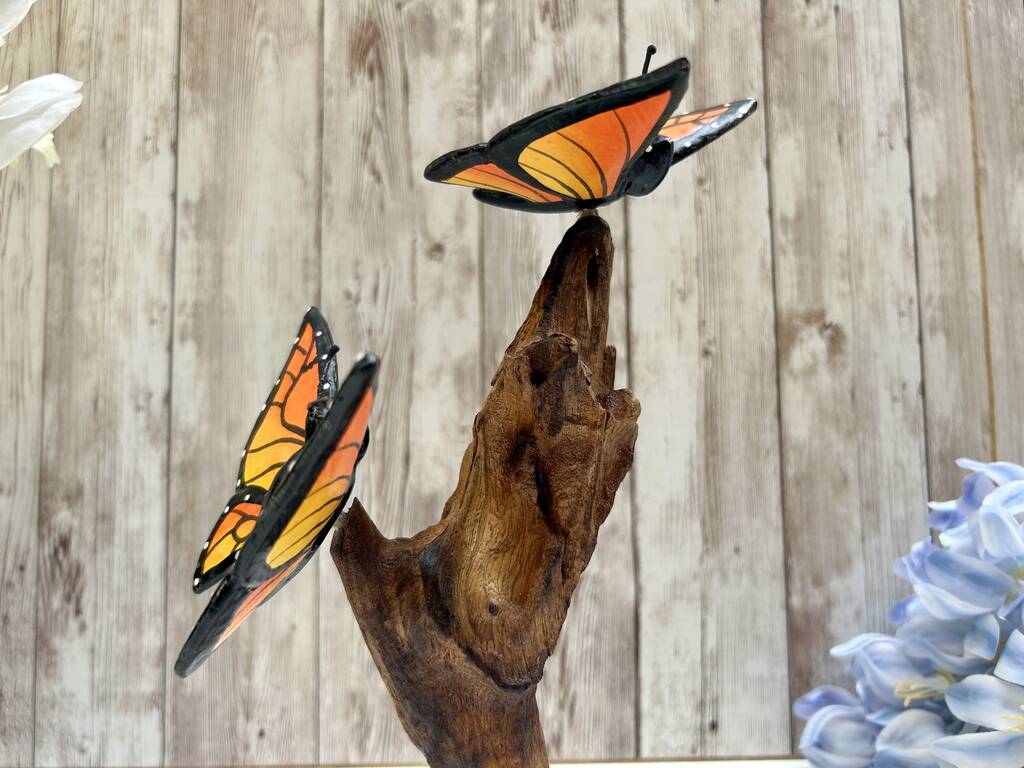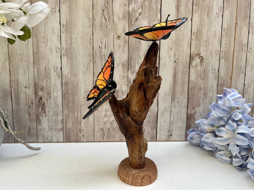 The driftwood base features 2 hand-carved Monarch butterflies.