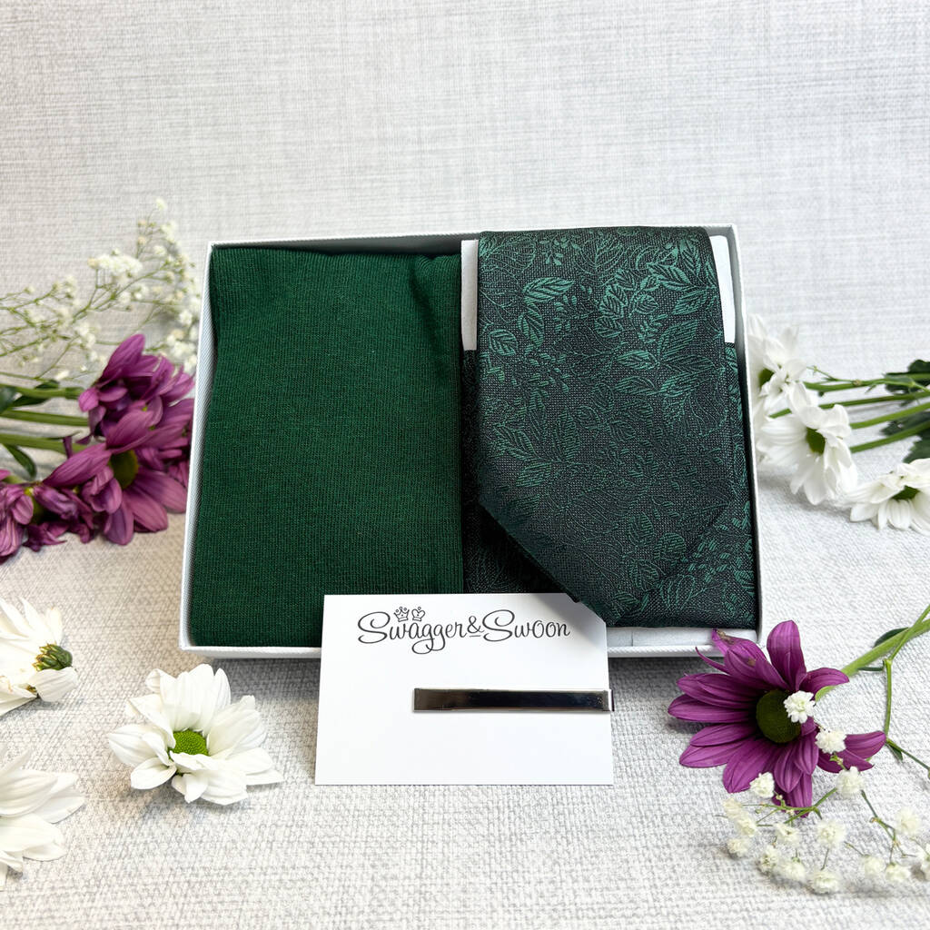 Dark Green Woodland Leaves Wedding Tie Set, 1 of 4