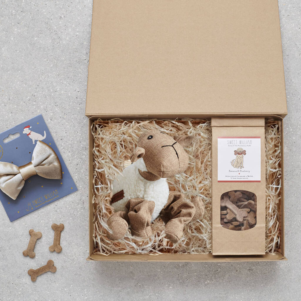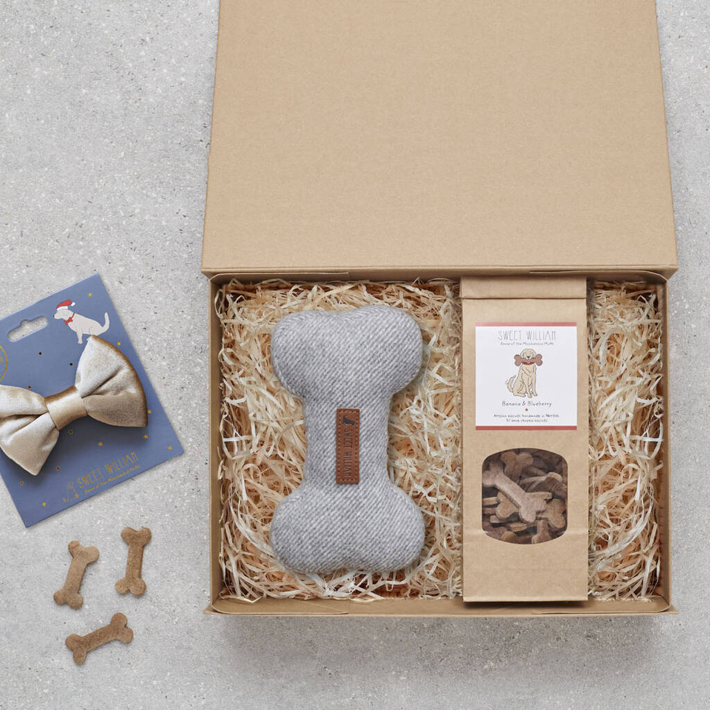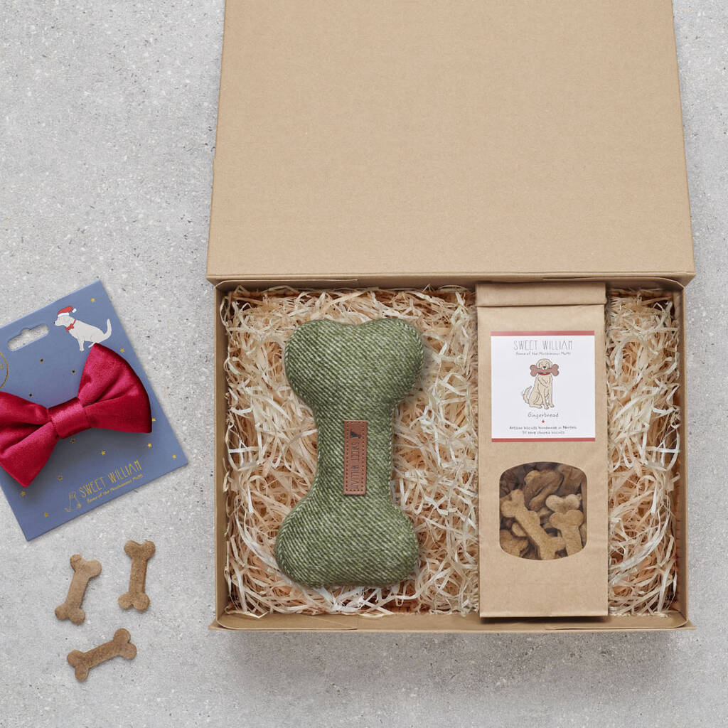 A luxury Christmas dog hamper filled with artisan dog treats, your choice of toy and a bow tie. The perfect seasonal spoil for beloved pups.