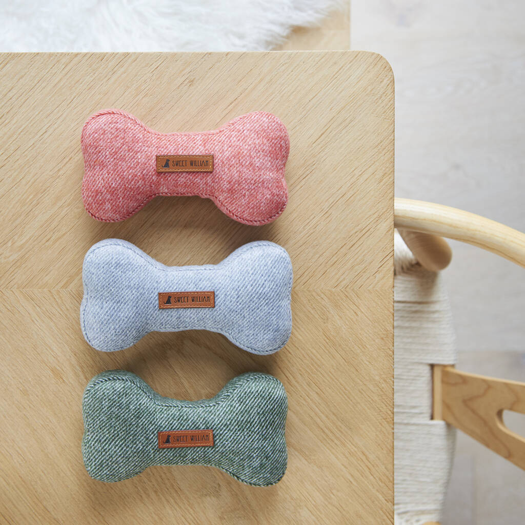You can also choose your dog’s toy. Pick one of our small tweed bone toys in Green, Orange or grey, or opt for Woolliam the Lamb, our bestselling soft toy loved for his charm and gentle snuggly feel. All toys are designed for soft play and seasonal excitement.