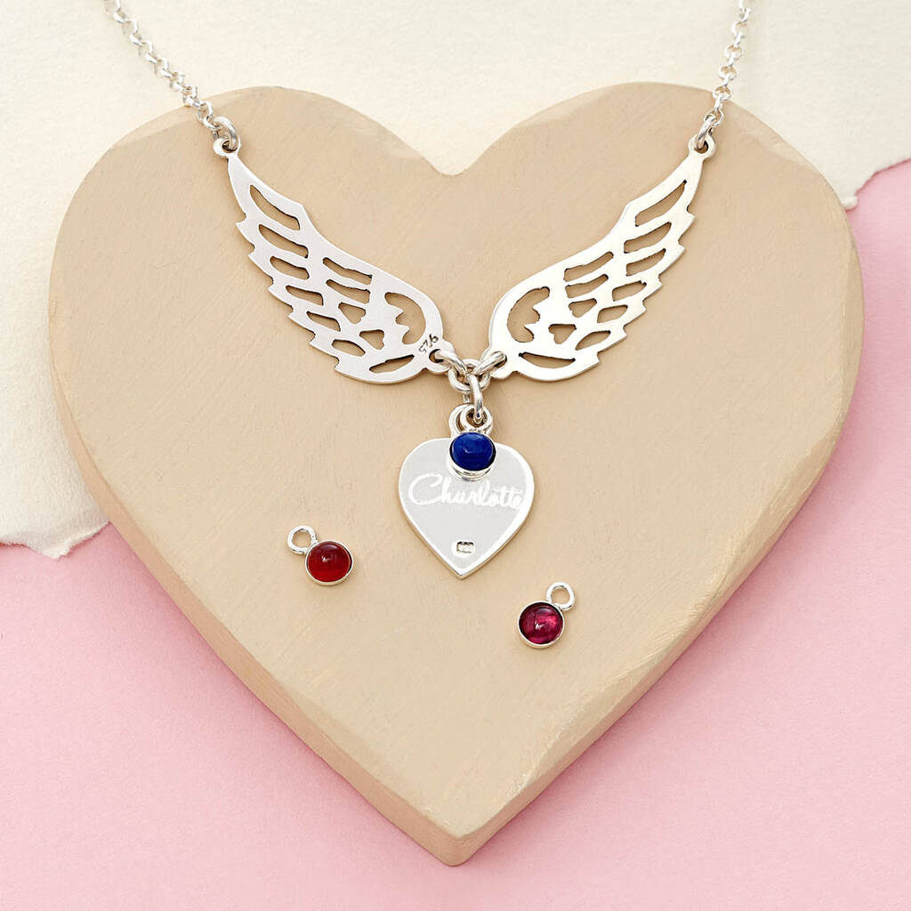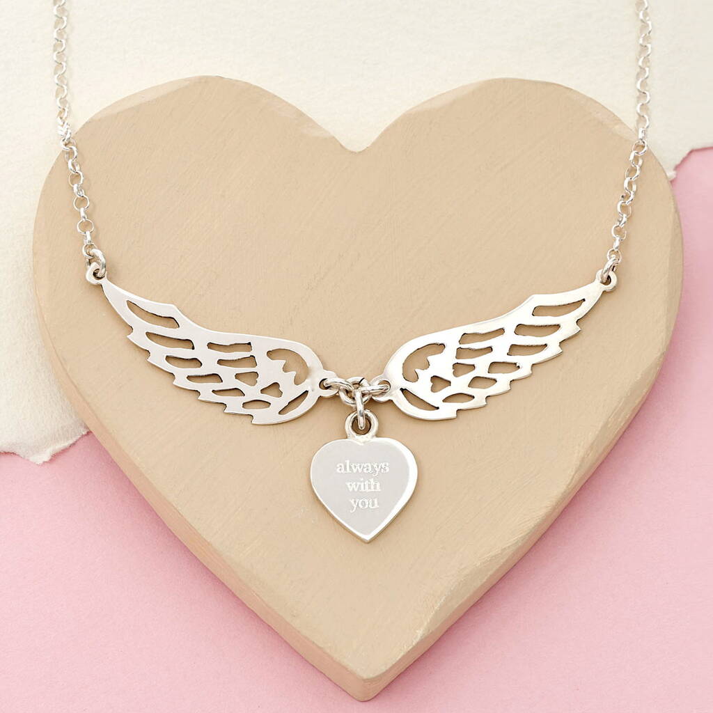 Personalisable Guardian Angel Wing necklace carries the special sentiment 'always with you' engraved on a sterling silver heart charm.