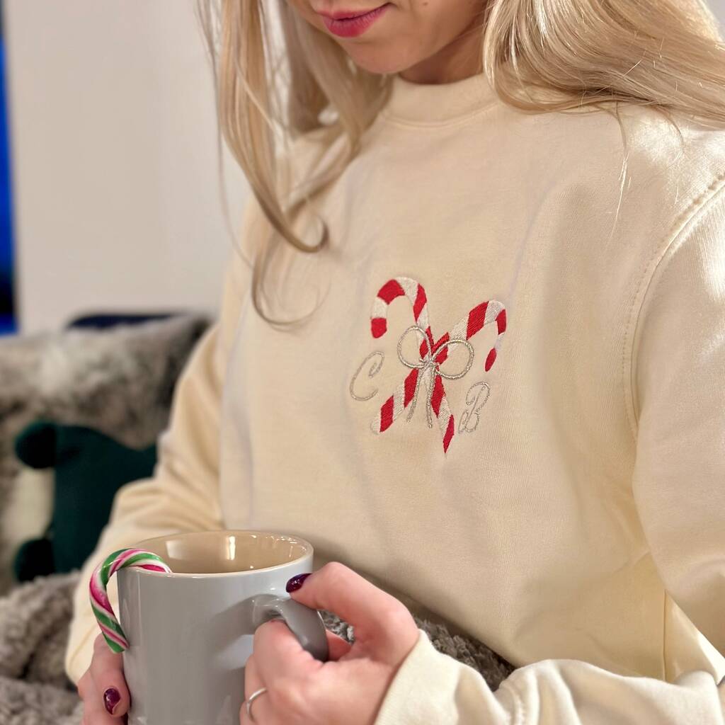 The design features two classic red-and-white candy canes crossed with a delicate embroidered bow at the centre, creating a timeless Christmas motif. Your chosen initials are then stitched elegantly on either side, adding a bespoke touch that makes every jumper unique – perfect for couples, families, or friends who love to match in festive style.