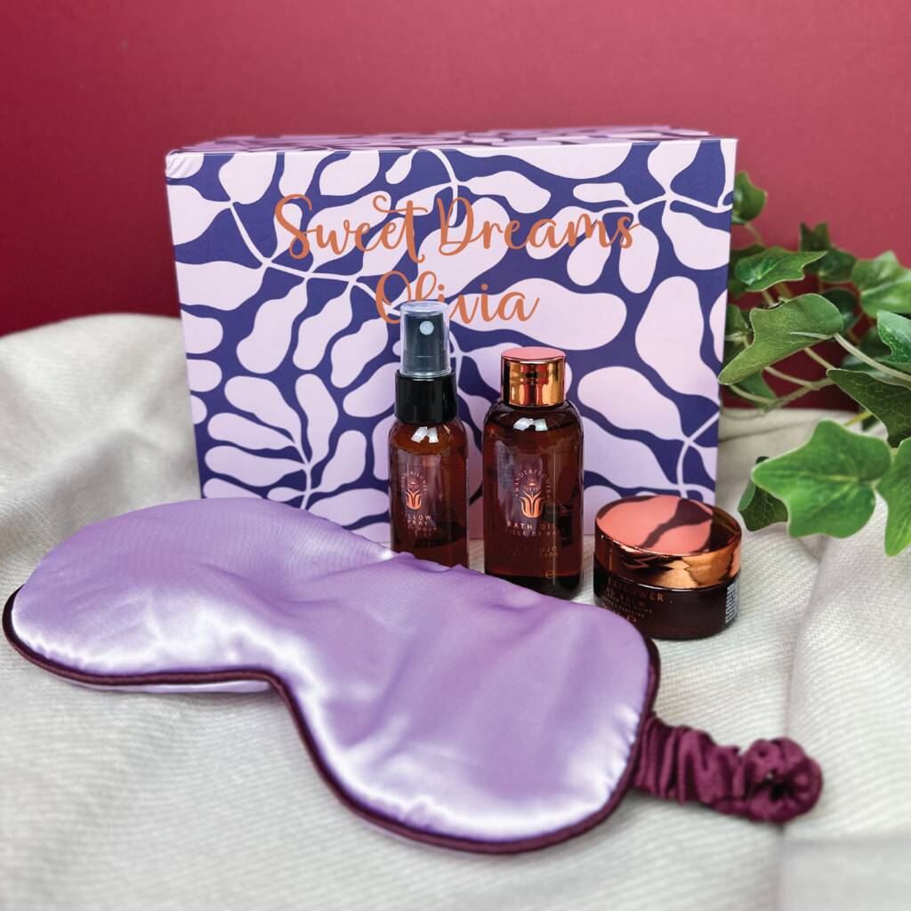 Personalised Beauty Sleep Gift Set in purple-pink box. Includes eye mask, pillow spray, bath oil, hand balm — perfect Christmas or birthday gift for her.