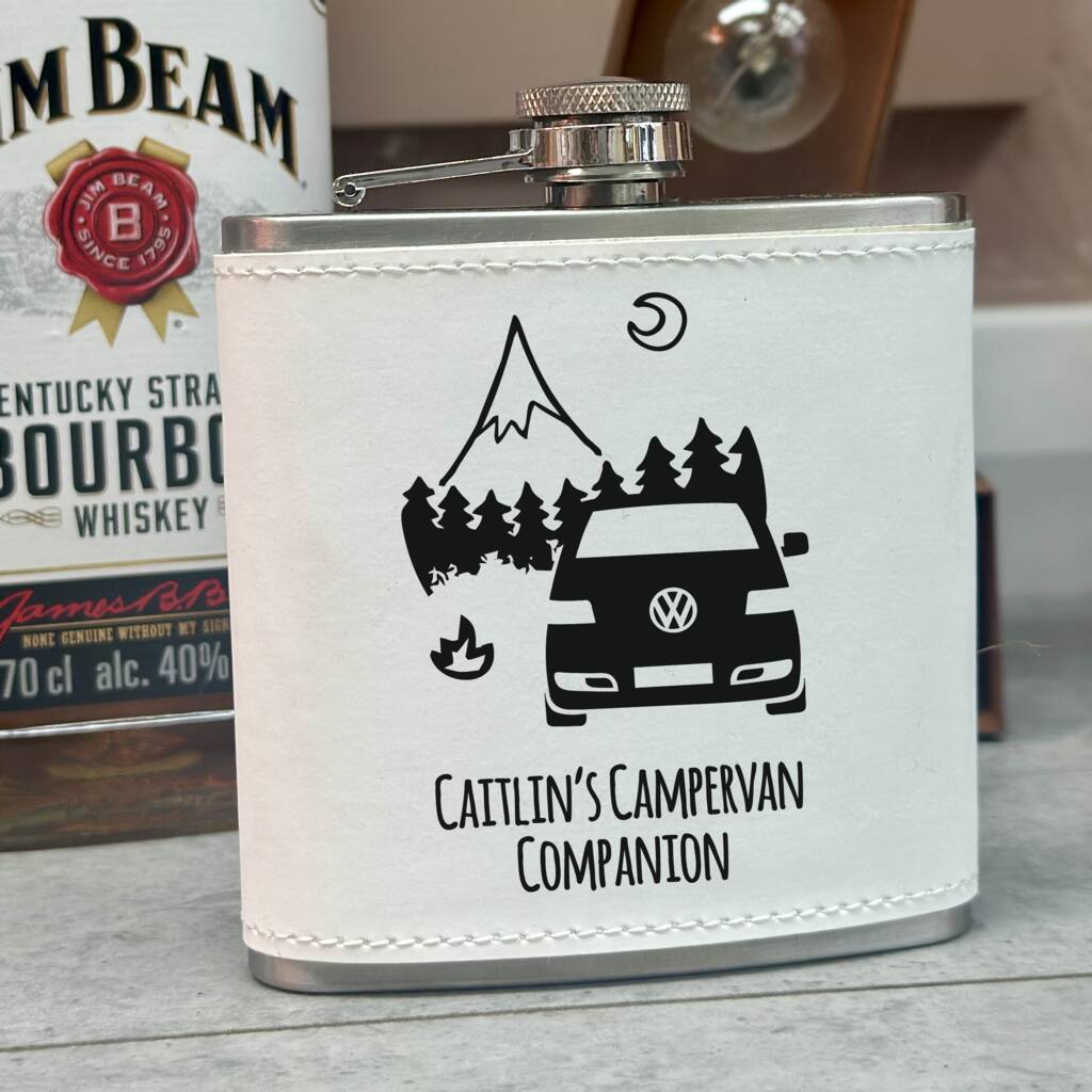 The personalised hip flask is printed with the image of a Campervan surrounded by mountains and a camp fire, making this the perfect gift for an individual, couple or family who love to take their campervan and go on big adventures and need a cheeky tipple to take with them!